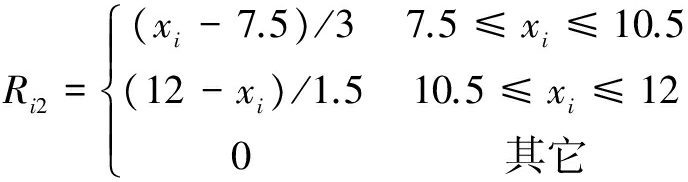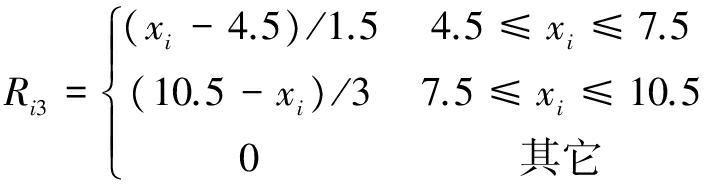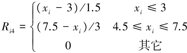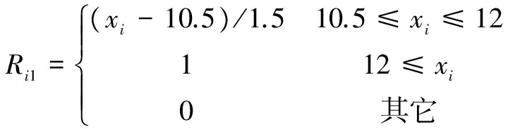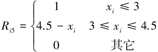 设式中xi表示第i种因素的值,Rij表示第i种因素对第j级的隶属度。每个基本因素所得模糊集如下:
