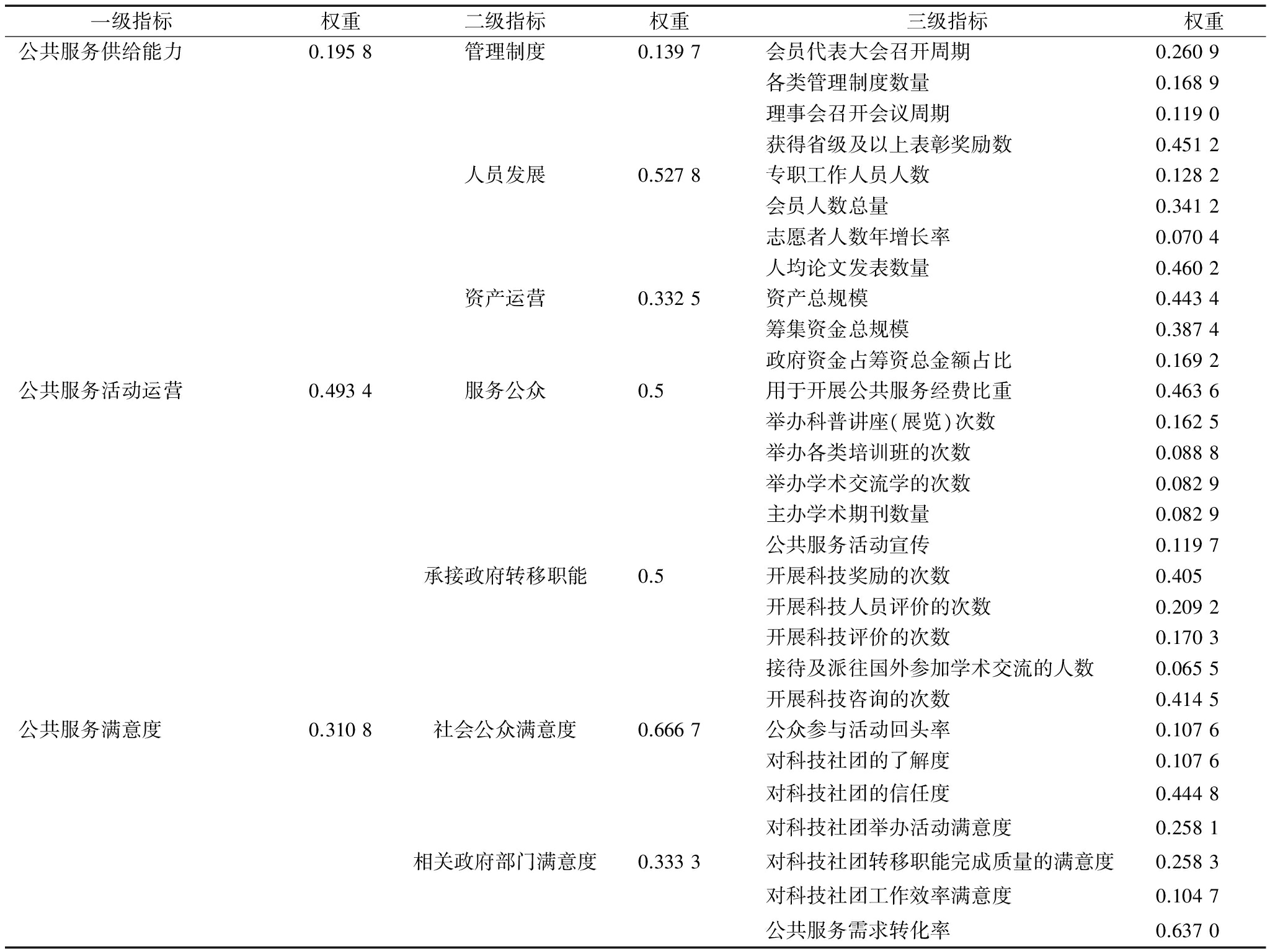 一级指标权重二级指标权重三级指标权重公共服务供给能力0.1958管理制度0.1397会员代表大会召开周期0.2609各类管理制度数量0.1689理事会召开会议周期0.1190获得省级及以上表彰奖励数0.4512人员发展0.5278专职工作人员人数0.1282会员人数总量0.3412志愿者人数年增长率0.0704人均论文发表数量0.4602资产运营0.3325资产总规模0.4434筹集资金总规模0.3874政府资金占筹资总金额占比0.1692公共服务活动运营0.4934服务公众0.5用于开展公共服务经费比重0.4636举办科普讲座(展览)次数0.1625举办各类培训班的次数0.0888举办学术交流学的次数0.0829主办学术期刊数量0.0829公共服务活动宣传0.1197承接政府转移职能0.5开展科技奖励的次数0.405开展科技人员评价的次数0.2092开展科技评价的次数0.1703接待及派往国外参加学术交流的人数0.0655开展科技咨询的次数0.4145公共服务满意度0.3108社会公众满意度0.6667公众参与活动回头率0.1076对科技社团的了解度0.1076对科技社团的信任度0.4448对科技社团举办活动满意度0.2581相关政府部门满意度0.3333对科技社团转移职能完成质量的满意度0.2583对科技社团工作效率满意度0.1047公共服务需求转化率0.6370