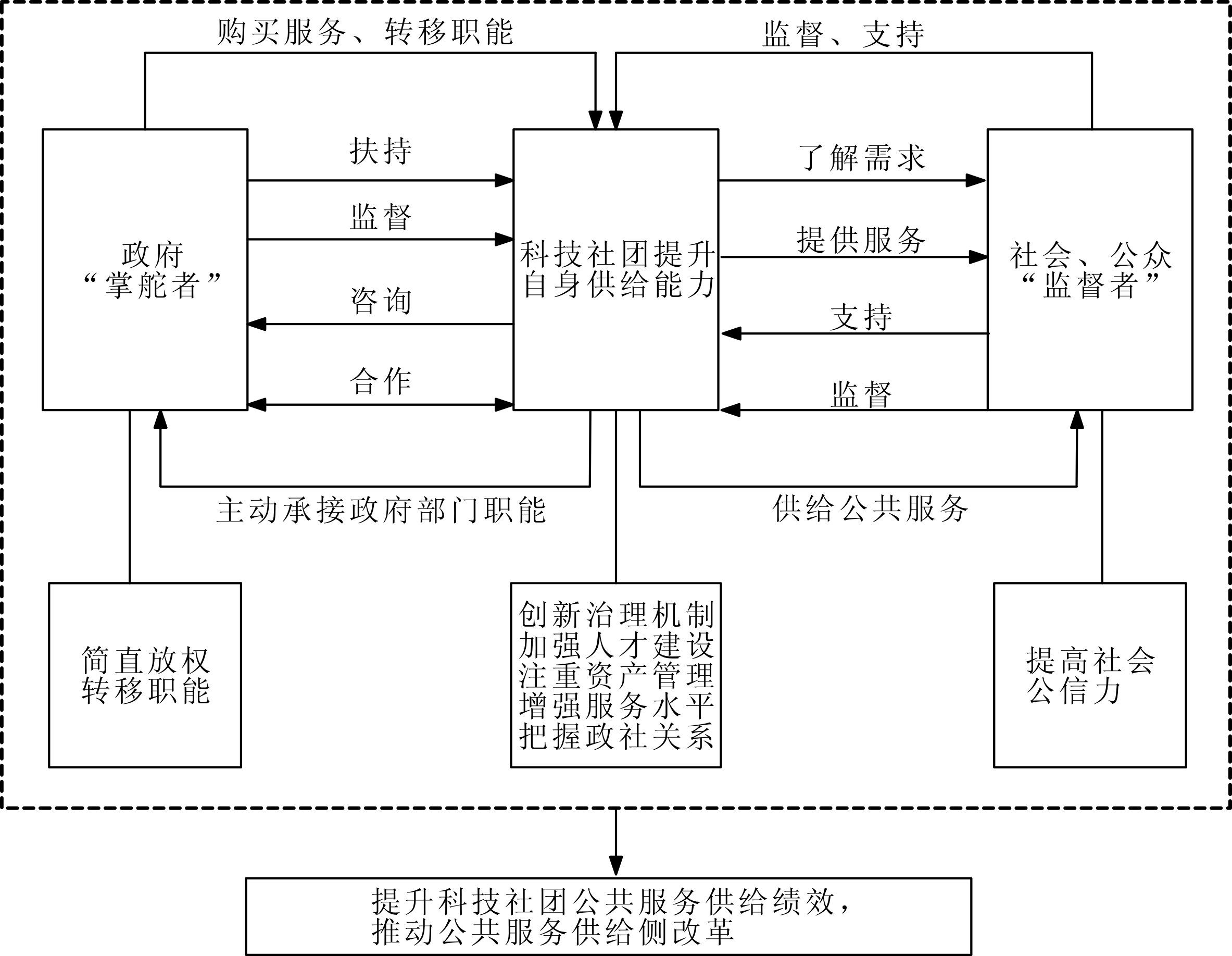 (1)把握政社关系,打造“双强”主体。将科技社团引入到公共服务领域并不代表政府完全失去了公共服务原有的相关职能与责任。科技社团与政府在公共服务领域内的理想状态应当是二者均作为供给主体在动态平衡中维持公共服务的正常运行,只是职能方向及所发挥的作用不同,政府要从原先的“划桨人”转向“掌舵人”,从具体事务中退出来,承担大方向的战略制定。科技社团则要从原来被动参与公共服务的状态转向积极主动承接并开拓新的公共服务职能。此外,随着供给侧改革不断推进和政府职能转移步伐的加快,科技社团要积极主动地与相关部门沟通互动,主动承接政府部门的职责与工作,充分发挥科协组织的“科技智囊团”作用,打造 “强政府+强社会”的双强供给模式。