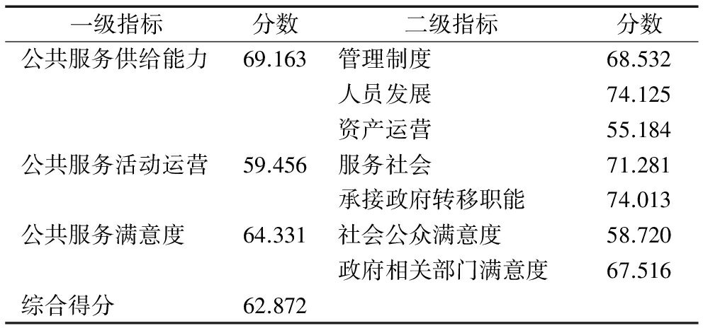 一级指标分数二级指标分数公共服务供给能力69.163管理制度68.532人员发展74.125资产运营55.184公共服务活动运营59.456服务社会71.281承接政府转移职能74.013公共服务满意度64.331社会公众满意度58.720政府相关部门满意度67.516综合得分62.872