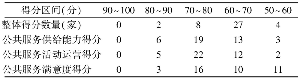 得分区间(分)90~10080~9070~8060~7050~60整体得分数量(家) 028274公共服务供给能力得分0619133公共服务活动运营得分0522122公共服务满意度得分 03161011