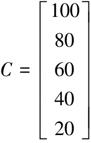 本文将评价集U=(优秀,良好,一般,较差,很差)由高到低赋值为100、80、60、40及20分,分值列向量为: