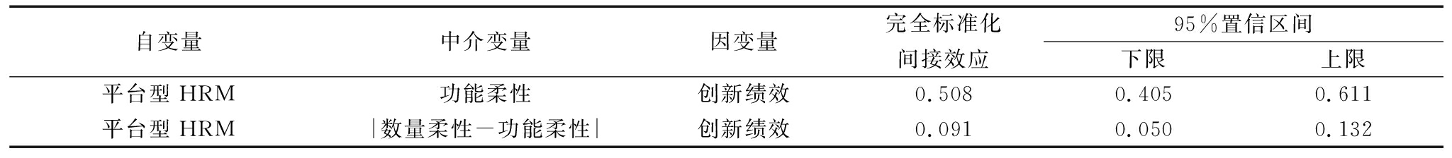 同时,应用MPLUS7.0软件进行Bootstrap分析,验证功能柔性和|数量柔性-功能柔性|对于平台型HRM与创新绩效关系中介效应的显著性。对随机抽取的5 000个样本进行分析,验证出平台型HRM通过功能柔性、|数量柔性-功能柔性|对创新绩效影响的标准化间接效应95%置信区间都不包括0(见表9),表明间接效应显著。综上,H4得到部分验证。