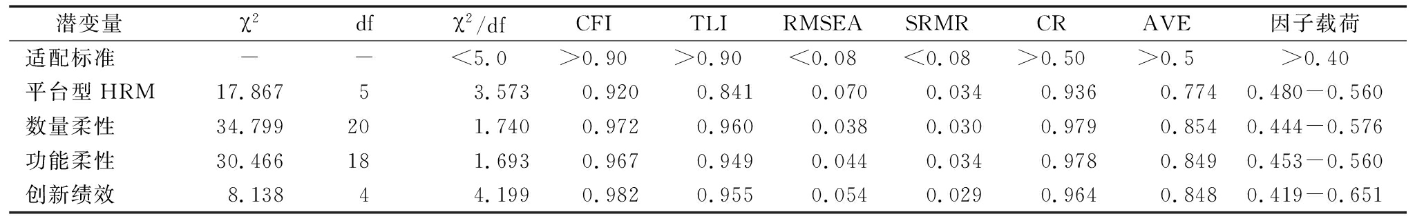 (1)信度。平台型HRM 量表的Cronbach′s α值为0.696,数量柔性量表的Cronbach′s α值为0.809,功能柔性量表的Cronbach′s α值为0.726,组织创新绩效量表的Cronbach′s α值为0.831,均接近或大于0.7。因此,本研究量表均具有较高的可靠性。