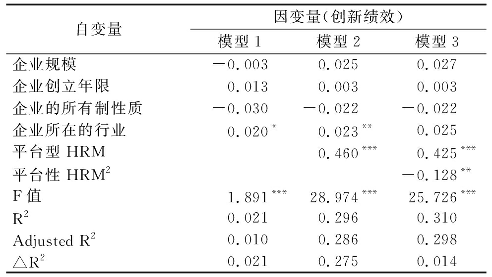 借鉴徐鹏等(2016)的研究方法,本研究采用SPSS19.0软件,运用层级回归方法,验证平台型HRM与创新绩效、人力资源双元柔性能力与创新绩效之间的曲线关系。为避免潜在的多重共线性问题,本研究对生成的平方项变量都进行了中心化处理。