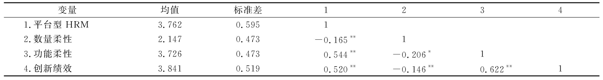 利用SPSS19.0对各变量的均值、标准差以及变量间相关关系进行分析,结果如表3所示。平台型HRM、数量柔性、功能柔性、创新绩效两两之间均呈显著相关关系。