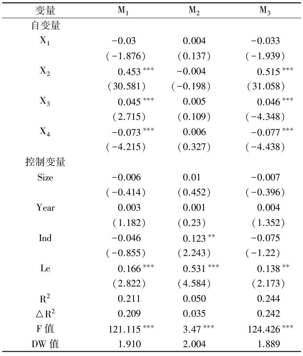(2)R&D投入对企业绩效的影响。R&D 投入对企业绩效的回归分析结果见表4。由表4(M1)可知,模型1的DW值为1.910,表明残差系列不存在序列相关,即回归方程能够充分说明被解释变量的变化规律。模型1回归结果表明:总体上R&D经费投入强度(X2)、R&D人员投入总量(X3)对企业绩效均有显著正向影响,即R&D经费投入强度与R&D人员投入总量越大,企业绩效越高,因此H1b,H1c成立。R&D人员投入强度(X4)对企业绩效有显著负向影响,即研发人员投入强度越大,企业绩效越低,因此H1d不成立。研发人员投入强度(X4)对企业绩效具有显著影响,但是二者关系并非正相关而是负相关。研发经费投入总量(X1)对企业绩效不具有显著影响,即H1a不成立。控制变量中,企业上市情况对企业绩效有显著正向影响,其余控制变量对企业绩效不具有显著影响。