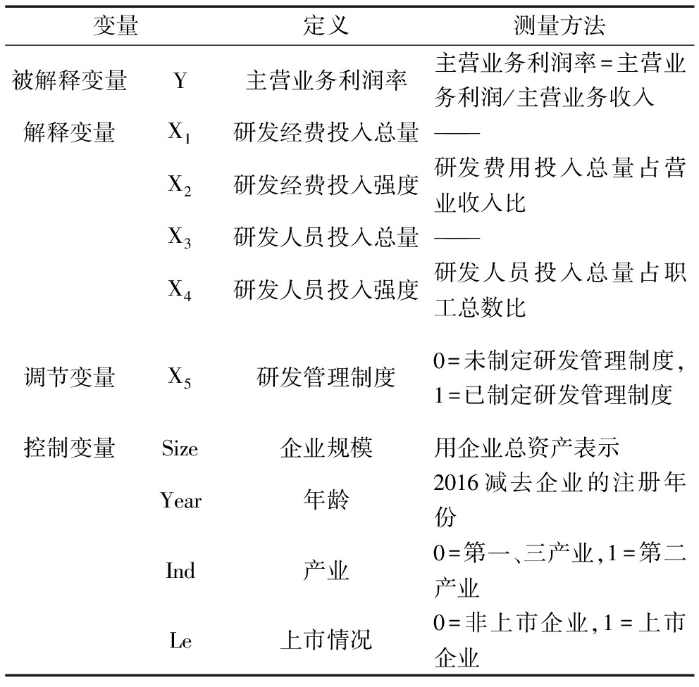 (1)被解释变量(Y)。本文采用的被解释变量指标为主营业务利润率(Y),计算公式如下:主营业务利润率(Y)=主营业务利润/主营业务收入。对科技型企业来说,其主营业务是销售高新科技产品,研发活动的经济效益主要通过产品销售体现。因此,在对科技型企业研发投入与企业绩效进行研究时,用主营业务利润衡量企业绩效,能够更合理地体现出研发投入与其对应关系。