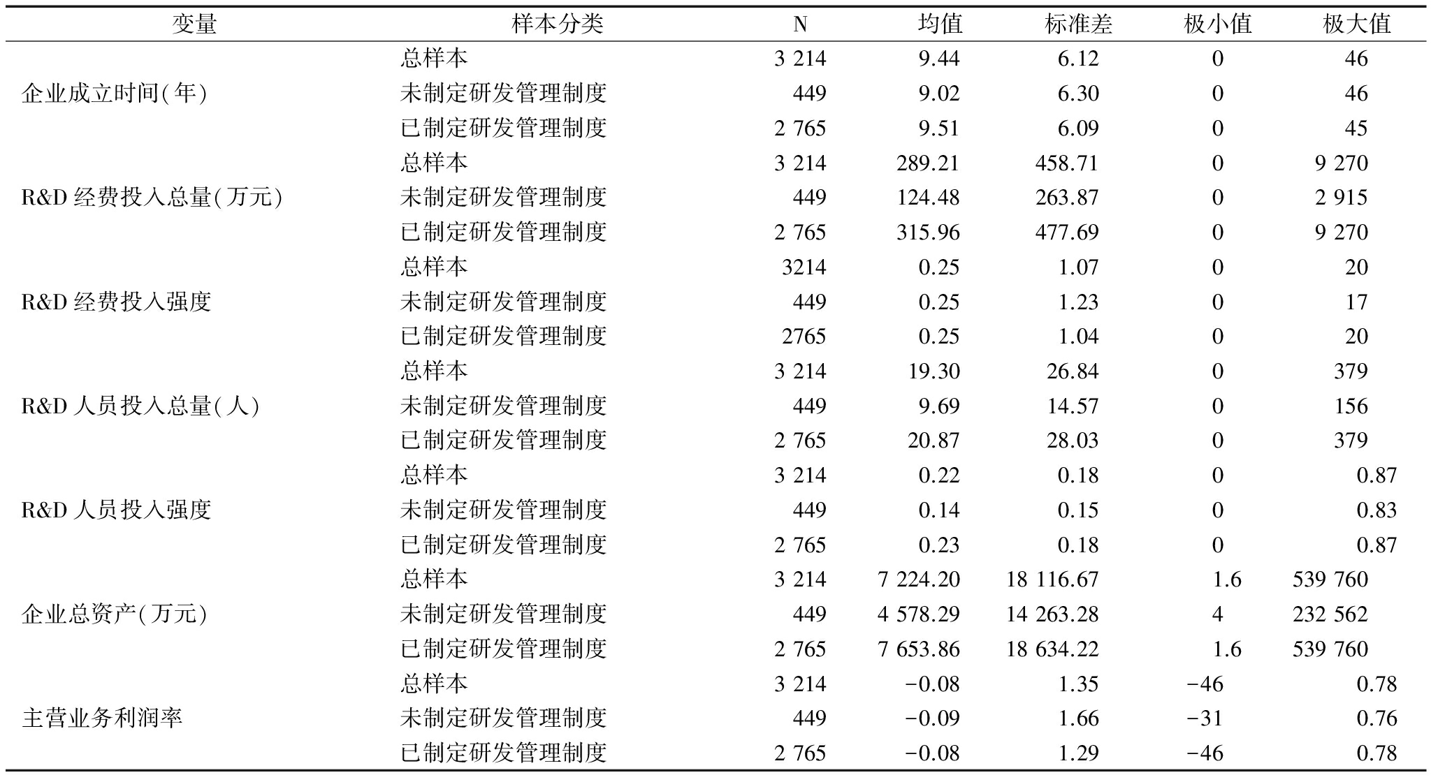 (3)调节变量。引入研发管理制度作为调节变量,探讨研发管理制度制定与否对R&D投入与企业绩效关系的调节作用。前者为分类变量,“0”代表没有制定,“1”代表已制定。本研究以研发管理制度制定与否作为调节变量,而非用程度指标进行考量,一方面是由于目前数据库中关于研发管理制度的数据只有“是”与“否”两个选项,并没有程度指标数据;另一方面由下文分析可知,共449家接近14.0%的企业尚未建立研发管理制度,这为本文提供了一个研究方向。在后续研究中,可将程度指标纳入到分析过程中,以提高实证分析的精确度。