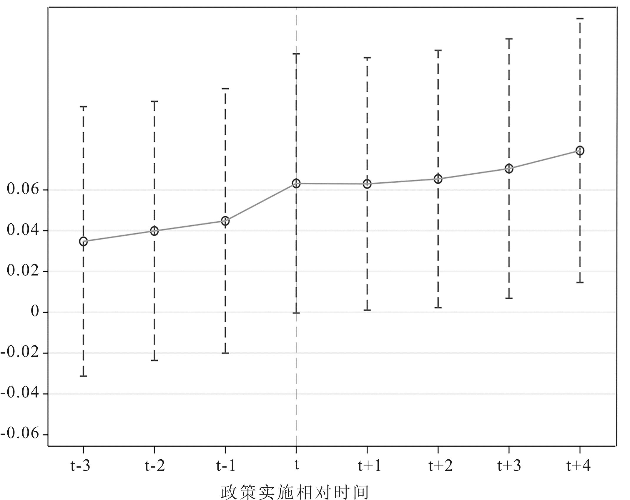 为了检验样本是否满足平衡趋势假设,本文对政策实施前实验组与对照组区域新质生产力发展水平是否具有相同变化趋势进行验证,如图1所示。由图1可知,在政策实施前,处理组与对照组区域新质生产力水平不存在明显差异,同时表明国家级大数据综合试验区政策实施后对区域新质生产力发展水平具有正向影响。