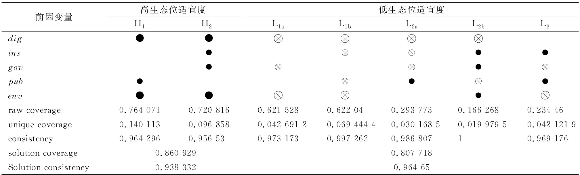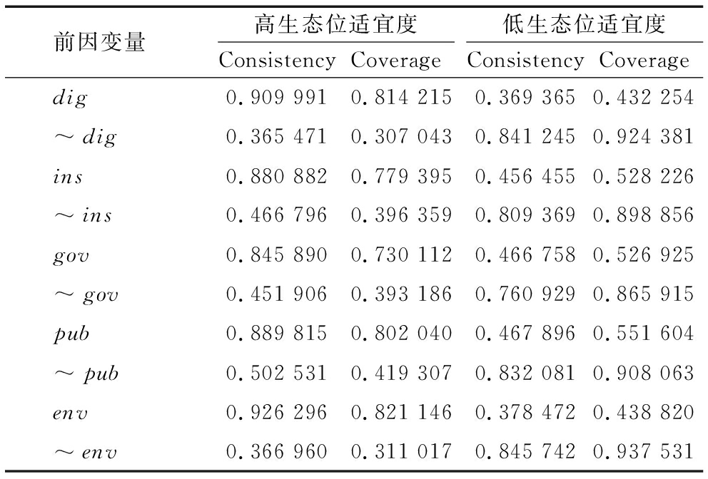 前因变量高生态位适宜度ConsistencyCoverage低生态位适宜度ConsistencyCoveragedig0.909 9910.814 2150.369 3650.432 254~dig0.365 4710.307 0430.841 2450.924 381ins0.880 8820.779 3950.456 4550.528 226~ins0.466 7960.396 3590.809 3690.898 856gov0.845 8900.730 1120.466 7580.526 925~gov0.451 9060.393 1860.760 9290.865 915pub0.889 8150.802 0400.467 8960.551 604~pub0.502 5310.419 3070.832 0810.908 063env0.926 2960.821 1460.378 4720.438 820~env0.366 9600.311 0170.845 7420.937 531