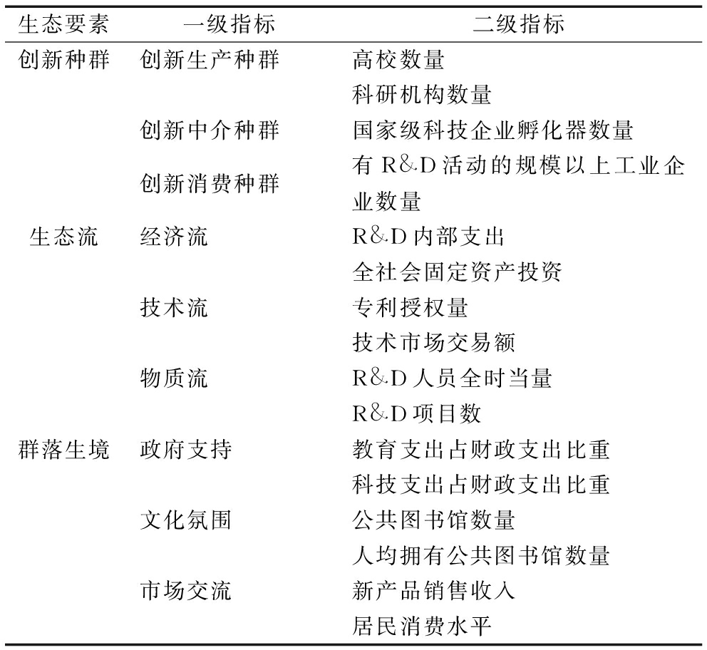生态要素一级指标二级指标创新种群创新生产种群高校数量科研机构数量创新中介种群国家级科技企业孵化器数量创新消费种群有R&D活动的规模以上工业企业数量生态流经济流R&D内部支出全社会固定资产投资技术流专利授权量技术市场交易额物质流R&D人员全时当量R&D项目数群落生境政府支持教育支出占财政支出比重科技支出占财政支出比重文化氛围公共图书馆数量人均拥有公共图书馆数量市场交流新产品销售收入居民消费水平