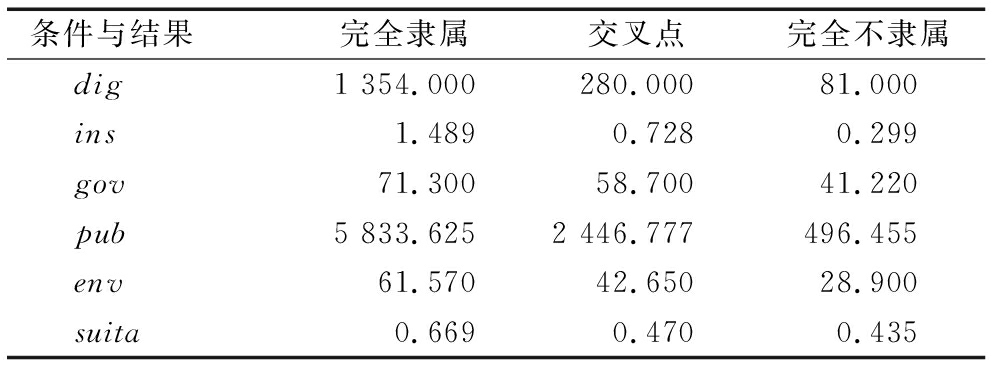 进行模糊集定性比较分析前,需要对数据重新校准,使其转为集合概念。基于前人研究,根据样本分布特征以及相关知识[24],本文将企业数字创新、数字环境的第75百分位数、第50百分位数、第25百分位数,依次设为完全隶属、交叉点、完全不隶属的校准锚点。将学研机构知识创新、政府数字治理、用户反馈等样本数据的第90百分位数、第50百分位数、第10百分位数,依次设为完全隶属、交叉点、完全不隶属的校准锚点。当校准后的模糊集隶属度为0.5时,会出现组态归属问题,为解决此问题,本文依照标准将隶属度为0.5的案例调整为0.501[24],结果见表2。