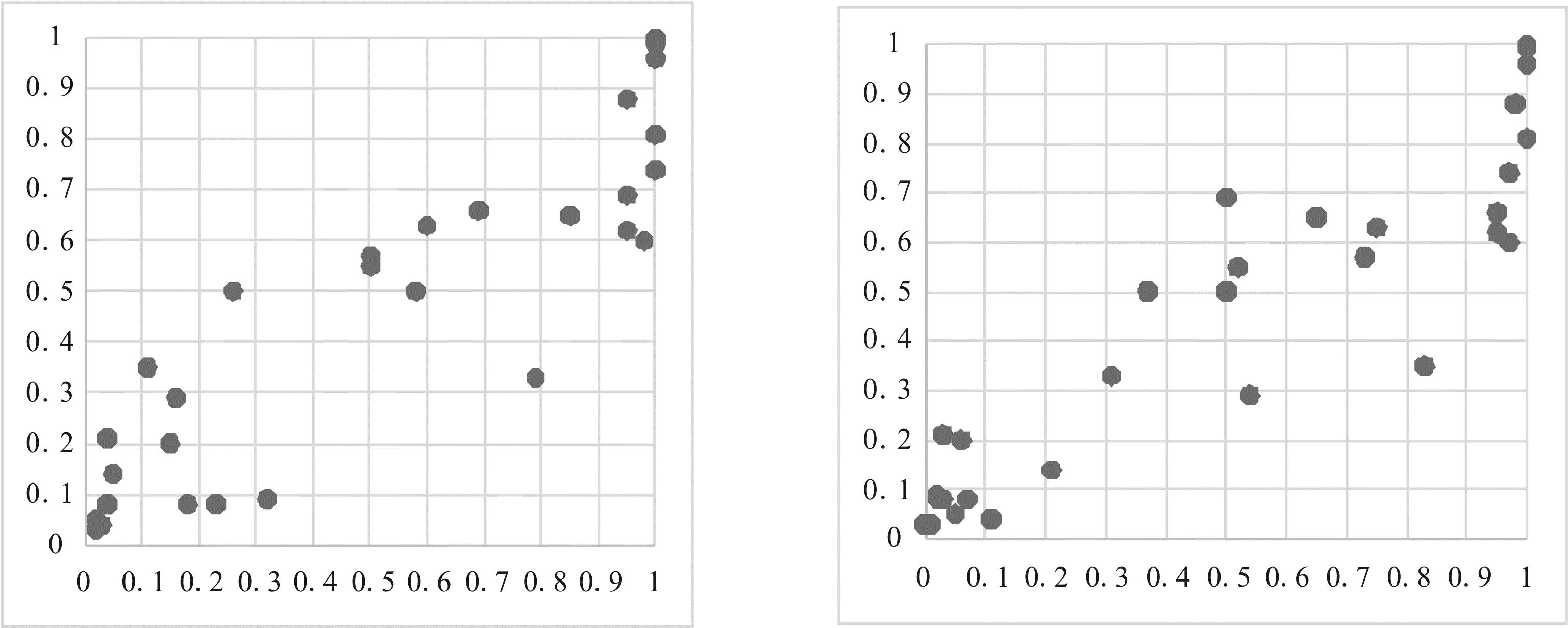 根据模糊集定性比较分析(fsQCA)研究步骤,组态分析前需检验单个前因变量的必要性,以判断其是否是构成结果变量发生的必要条件。本文运用fsQCA软件进行必要性分析,结果如表3所示。可以发现,在低生态位适宜度必要条件检验中,所有前因变量的一致性均低于临界值0.9,说明所有单个前因变量均不是构成低生态位适宜度的必要条件。在高生态位适宜度必要条件检验中,企业数字创新和数字环境的一致性分别为0.909 991、0.926 296(高于0.9的临界值),说明两者可能是引致高生态位适宜度的必要条件,需要作进一步分析。通过绘制企业数字创新、数字环境与生态位适宜度的X-Y散点图,如图2、图3所示,可以发现,接近2/3的案例点集中分布在左侧Y轴和右侧Y轴附近,且1/3的案例点分布在对角线以上,即均不构成两者相关性,因此单个的企业数字创新和数字环境均不是引致高态位适宜度的必要条件[25]。