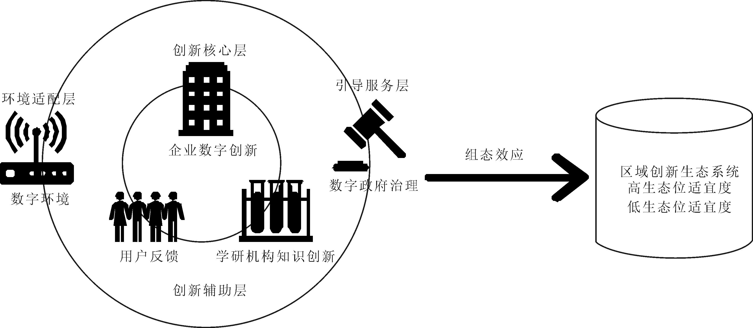 区域创新生态系统生态位适宜度是区域经济研究关注的焦点,近年来我国不同地区创新生态系统生态位适宜度虽然有所提升,但整体水平偏低,并存在东高西低、南强北弱的不均衡发展特征。具体而言,我国仅有20%的省市创新生态系统生态位处于相对理想状态,且集中分布在我国华东地区和华北地区,而80%的地区创新生态系统生态位与理想生态位差距较大。其中,东北地区、西北地区的生态位处于落后水平(解学梅等,2021)。党的二十大报告指出,高质量发展是全面建设社会主义现代化国家的首要任务,深入实施区域协调发展战略,构建优势互补、高质量发展的区域经济布局。创新生态系统建设是实现经济高质量发展、促进区域协调的重要途径[1]。随着大数据、区块链、人工智能等新一代数字技术的广泛应用,在数字技术赋能创新主体、数字资源不断融入创新过程的同时,资源、劳动、知识、信息等各类创新要素的交互方式发生转变[2],进而导致生态系统内各主体占据的生态位发生改变。在数字情境下,各主体间耦合协调是提升区域创新生态系统生态位适宜度的关键所在。因此,如何有效协同企业、政府等主体逻辑关系?如何通过优化数字环境,进而更好地促进生态位适宜度提升?解决上述问题对于提升我国区域创新生态系统整体效能具有重要的现实意义。