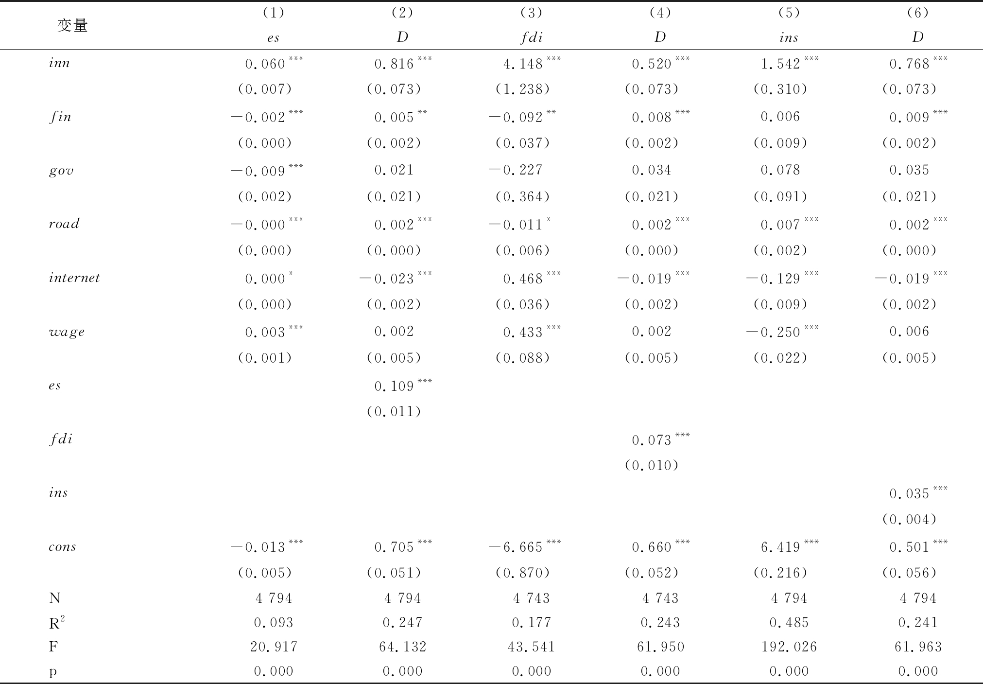 变量 (1)(2)(3)(4)(5)(6)esDfdiDinsDinn0.060***0.816***4.148***0.520***1.542***0.768***(0.007)(0.073)(1.238)(0.073)(0.310)(0.073)fin-0.002***0.005**-0.092**0.008***0.0060.009***(0.000)(0.002)(0.037)(0.002)(0.009)(0.002)gov-0.009***0.021-0.2270.0340.0780.035(0.002)(0.021)(0.364)(0.021)(0.091)(0.021)road-0.000***0.002***-0.011*0.002***0.007***0.002***(0.000)(0.000)(0.006)(0.000)(0.002)(0.000)internet0.000*-0.023***0.468***-0.019***-0.129***-0.019***(0.000)(0.002)(0.036)(0.002)(0.009)(0.002)wage0.003***0.0020.433***0.002-0.250***0.006(0.001)(0.005)(0.088)(0.005)(0.022)(0.005)es0.109***(0.011)fdi0.073***(0.010)ins0.035***(0.004)cons-0.013***0.705***-6.665***0.660***6.419***0.501***(0.005)(0.051)(0.870)(0.052)(0.216)(0.056)N4 7944 7944 7434 7434 7944 794R20.0930.2470.1770.2430.4850.241F20.91764.13243.54161.950192.02661.963p0.0000.0000.0000.0000.0000.000