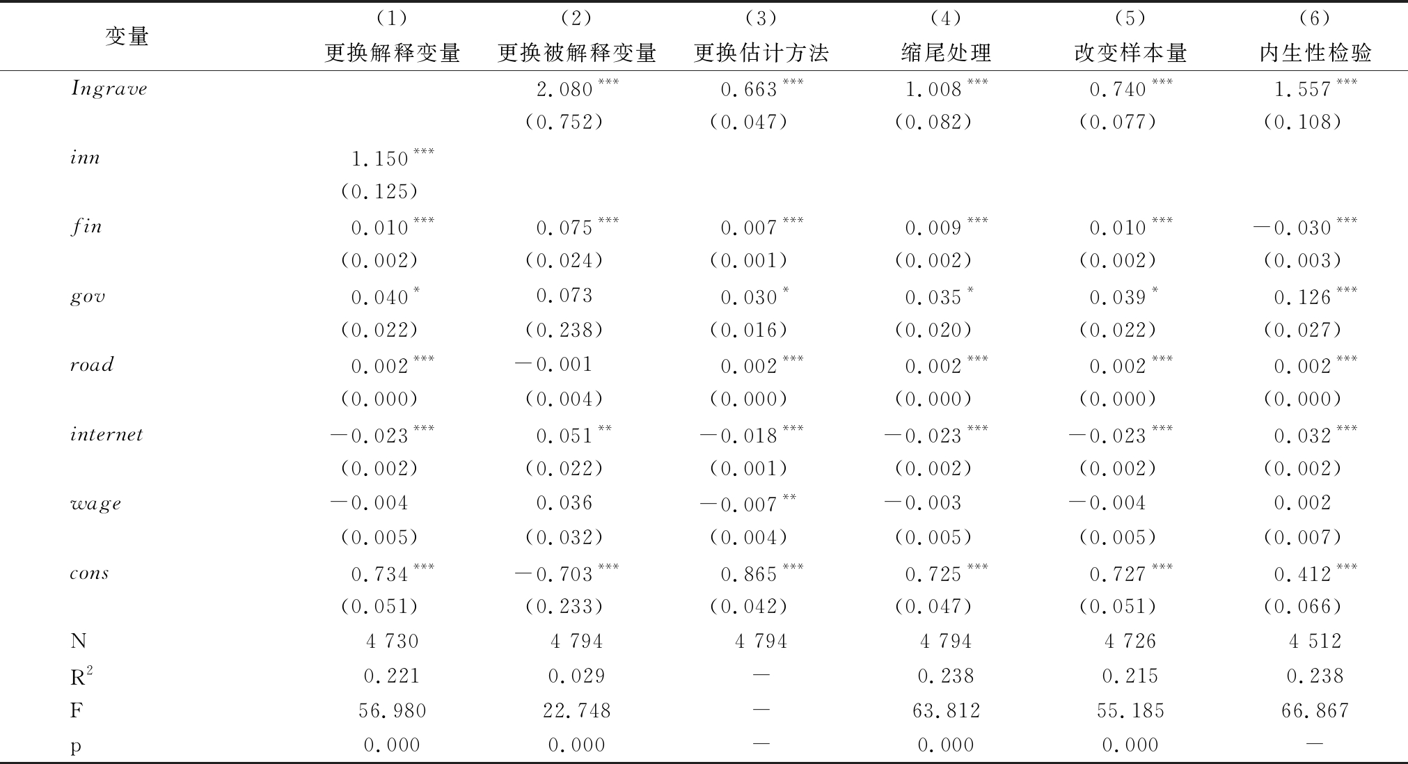 变量 (1)(2)(3)(4)(5)(6)更换解释变量更换被解释变量更换估计方法缩尾处理改变样本量内生性检验Ingrave2.080***0.663***1.008***0.740***1.557***(0.752)(0.047)(0.082)(0.077)(0.108)inn1.150***(0.125)fin0.010***0.075***0.007***0.009***0.010***-0.030***(0.002)(0.024)(0.001)(0.002)(0.002)(0.003)gov0.040*0.0730.030*0.035*0.039*0.126***(0.022)(0.238)(0.016)(0.020)(0.022)(0.027)road0.002***-0.0010.002***0.002***0.002***0.002***(0.000)(0.004)(0.000)(0.000)(0.000)(0.000)internet-0.023***0.051**-0.018***-0.023***-0.023***0.032***(0.002)(0.022)(0.001)(0.002)(0.002)(0.002)wage-0.0040.036-0.007**-0.003-0.0040.002(0.005)(0.032)(0.004)(0.005)(0.005)(0.007)cons0.734***-0.703***0.865***0.725***0.727***0.412***(0.051)(0.233)(0.042)(0.047)(0.051)(0.066)N4 7304 7944 7944 7944 7264 512R20.2210.029-0.2380.2150.238F56.98022.748-63.81255.18566.867p0.0000.000-0.0000.000-