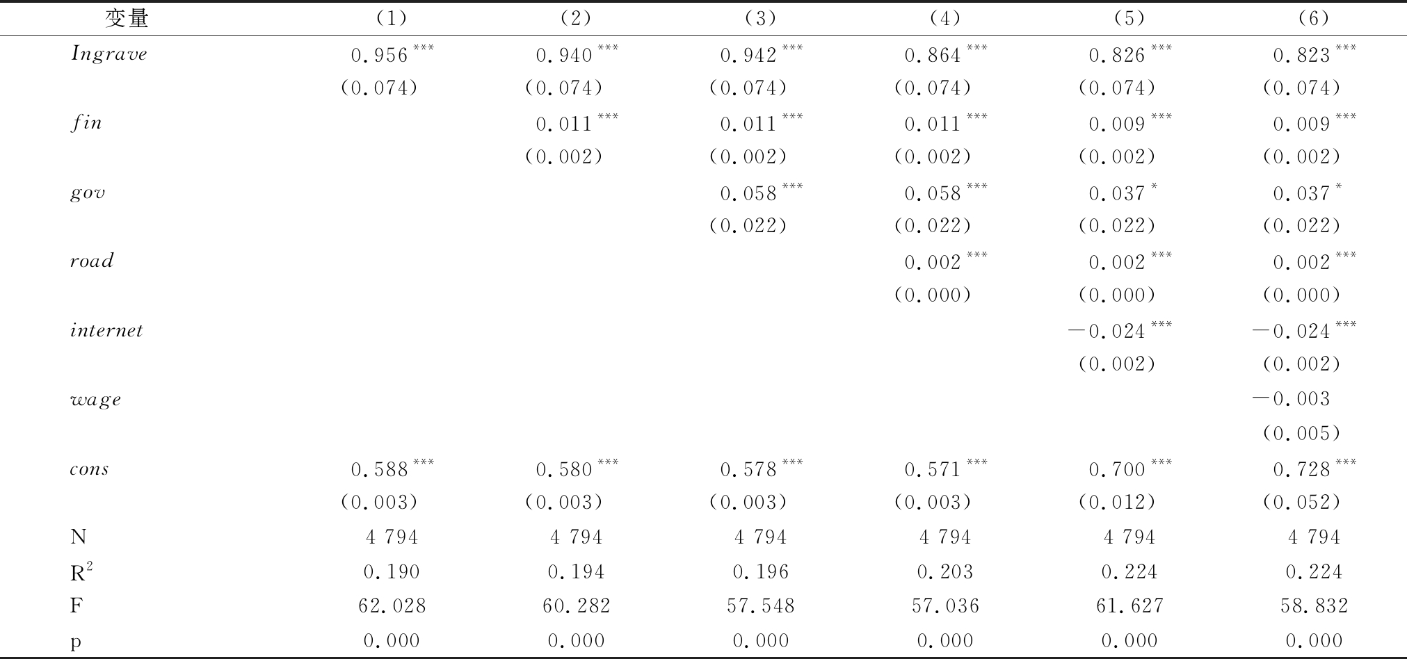 变量 (1)(2)(3)(4)(5)(6)Ingrave0.956***0.940***0.942***0.864***0.826***0.823***(0.074)(0.074)(0.074)(0.074)(0.074)(0.074)fin0.011***0.011***0.011***0.009***0.009***(0.002)(0.002)(0.002)(0.002)(0.002)gov0.058***0.058***0.037*0.037*(0.022)(0.022)(0.022)(0.022)road0.002***0.002***0.002***(0.000)(0.000)(0.000)internet-0.024***-0.024***(0.002)(0.002)wage-0.003(0.005)cons0.588***0.580***0.578***0.571***0.700***0.728***(0.003)(0.003)(0.003)(0.003)(0.012)(0.052)N4 7944 7944 7944 7944 7944 794R20.1900.1940.1960.2030.2240.224F62.02860.28257.54857.03661.62758.832p0.0000.0000.0000.0000.0000.000