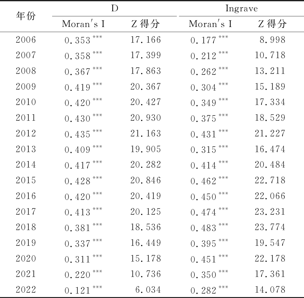 年份DMoran's IZ得分IngraveMoran's IZ得分20060.353***17.1660.177***8.99820070.358***17.3990.212***10.71820080.367***17.8630.262***13.21120090.419***20.3670.304***15.18920100.420***20.4270.349***17.33420110.430***20.9300.375***18.52920120.435***21.1630.431***21.22720130.409***19.9050.315***16.47420140.417***20.2820.414***20.48420150.428***20.8460.462***22.71820160.420***20.4190.450***22.06620170.413***20.1250.474***23.23120180.381***18.5360.483***23.77420190.337***16.4490.395***19.54720200.311***15.1780.451***22.17820210.220***10.7360.350***17.36120220.121***6.0340.282***14.078