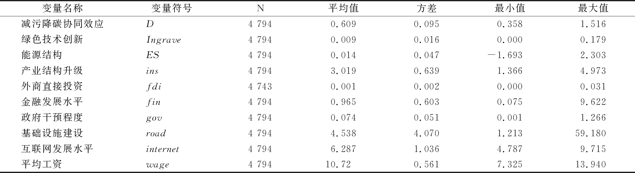为避免遗漏重要变量对回归结果造成的不良影响,本文选取以下5个控制变量:①金融发展水平:发达的金融市场能提供更多金融支持和创新工具,更有利于绿色技术创新和减污降碳协同效应提升,参考周立等[38]的做法,用金融机构人民币贷款余额与GDP比值衡量;②政府干预程度:政府在低碳发展中起重要作用,通过投资和税收优惠政策促进低碳项目发展,从而提升减污降碳效率,参考林伯强等[39]的做法,用政府财政支出占GDP的比值衡量;③基础设施建设:基础设施尤其是交通基础设施完善能有效减少道路拥堵和尾气排放,从而降低空气污染和碳排放,参考程中海等[40]的做法,用年末实有城市道路面积的对数衡量;④互联网发展水平:互联网发展能提高工作效率、资源利用效率和能源利用效率,从而对碳排放和环境污染产生积极影响,参考汪东芳等(2019)的做法,采用互联网宽带接入用户数对数衡量;⑤职工平均工资:平均工资水平高会使人们更倾向于消费高能耗、高排放产品和服务,从而不利于减污降碳效率提升。