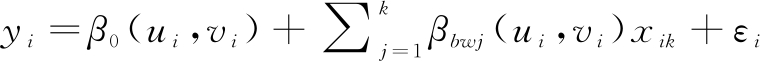 其中,yi为i城市的减污降碳协同效应值,xik为i城市的解释变量值,(ui,vi)表示i城市地理坐标,β0(ui,vi)为常数项,βbwj(ui,vi)为使用特定带宽后i城市j解释变量的回归系数,εi为随机误差。