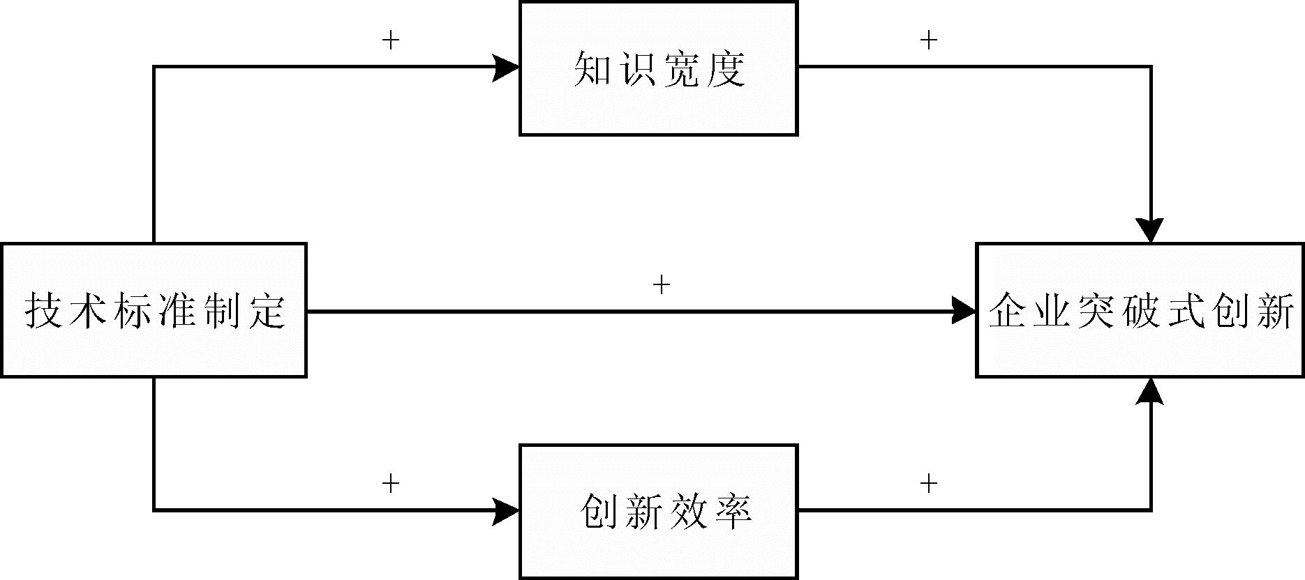 创新效率能够反映企业资源整合能力和快速响应能力,决定其实现突破式创新的可能性。创新效率较高的企业能够以较快速度进行技术调整,为突破式创新提供更为宽松的容错空间(何郁冰等,2023)。然而,由于突破式创新活动的复杂性、风险性和周期性等特征,受制于资源约束,“专精特新”企业内部研发投资不足,不利于突破式创新活动顺利开展。因此,技术标准制定所形成的创新网络对“专精特新”企业创新效率提升发挥重要作用。一方面,技术标准创新网络有助于各创新主体间实现资源共享和优势互补,通过合作共同分担研发成本和风险,克服单个企业内部研发投资不足的问题[24],能够有效提升企业创新效率。另一方面,技术标准创新网络以产业共性技术需求为核心,能够为企业提供前沿技术发展相关信息[25]。这种信息优势有助于企业掌握技术发展趋势、减少重复投入、加速研发进程,从而实现突破式创新。基于此,本文提出以下假设:
