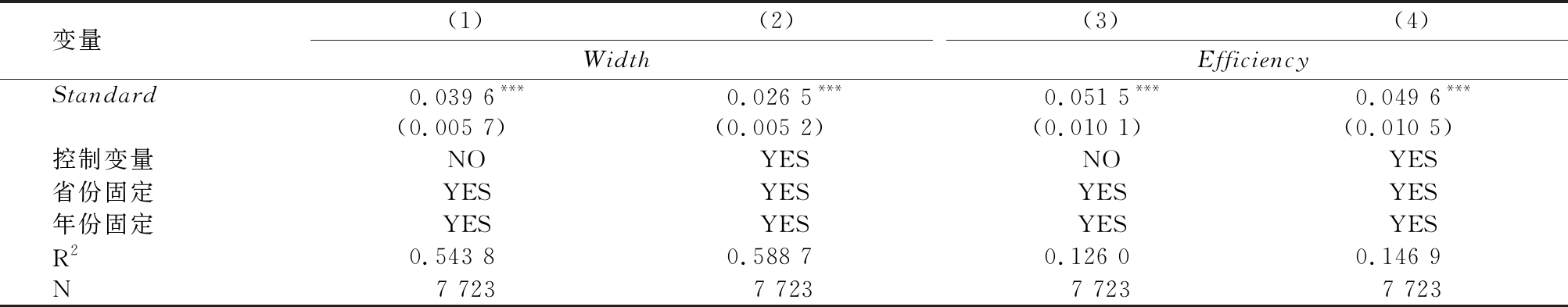 变量(1)(2)Width(3)(4)EfficiencyStandard0.039 6***0.026 5***0.051 5***0.049 6***(0.005 7)(0.005 2)(0.010 1)(0.010 5)控制变量NOYESNOYES省份固定YESYESYESYES年份固定YESYESYESYESR20.543 80.588 70.126 00.146 9N7 7237 7237 7237 723