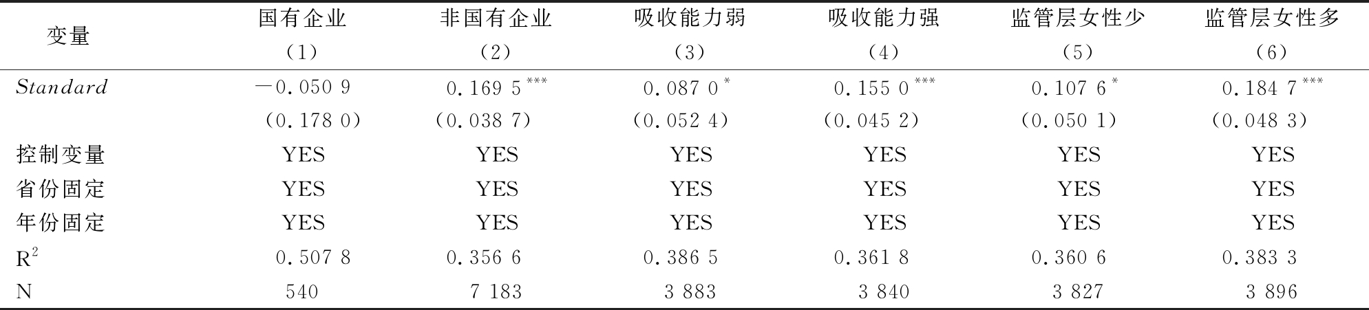 变量国有企业非国有企业吸收能力弱吸收能力强监管层女性少监管层女性多(1)(2)(3)(4)(5)(6)Standard-0.050 90.169 5***0.087 0*0.155 0***0.107 6*0.184 7***(0.178 0)(0.038 7)(0.052 4)(0.045 2)(0.050 1)(0.048 3)控制变量YESYESYESYESYESYES省份固定YESYESYESYESYESYES年份固定YESYESYESYESYESYESR20.507 80.356 60.386 50.361 80.360 60.383 3N5407 1833 8833 8403 8273 896