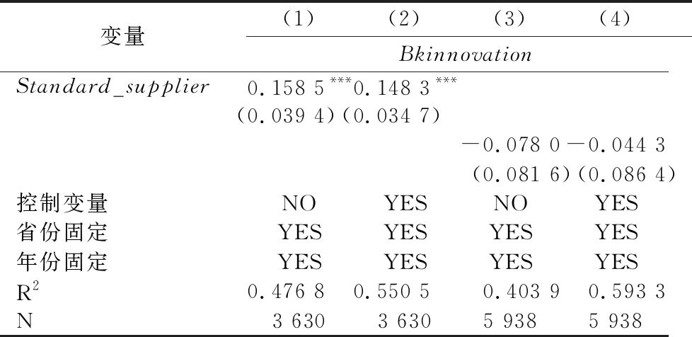变量(1)(2)(3)(4)BkinnovationStandard_supplier0.158 5***0.148 3***(0.039 4)(0.034 7)-0.078 0-0.044 3(0.081 6)(0.086 4)控制变量NOYESNOYES省份固定YESYESYESYES年份固定YESYESYESYESR20.476 80.550 50.403 90.593 3N3 6303 6305 9385 938
