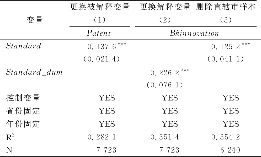 变量更换被解释变量(1)Patent更换解释变量删除直辖市样本(2)(3)BkinnovationStandard0.137 6***0.125 2***(0.021 4)(0.041 1)Standard_dum0.226 2***(0.076 1)控制变量YESYESYES省份固定YESYESYES年份固定YESYESYESR20.282 10.351 40.354 2N7 7237 7236 240