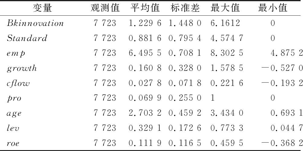 变量观测值平均值标准差最大值最小值Bkinnovation7 7231.229 61.448 06.16120Standard7 7230.881 60.795 44.574 70emp7 7236.495 50.708 18.302 54.875 2 growth7 7230.160 80.328 01.578 5-0.527 0cflow7 7230.027 80.071 80.221 6-0.193 2pro7 7230.069 90.255 010age7 7232.703 20.459 23.434 00.693 1lev7 7230.329 10.172 60.773 30.044 7roe7 7230.111 90.116 50.459 5-0.368 2
