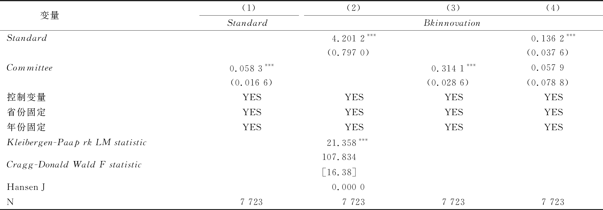 变量(1)Standard(2)(3)(4)BkinnovationStandard4.201 2***0.136 2***(0.797 0)(0.037 6)Committee0.058 3***0.314 1***0.057 9(0.016 6)(0.028 6)(0.078 8)控制变量YESYESYESYES省份固定YESYESYESYES年份固定YESYESYESYESKleibergen-Paap rk LM statistic21.358***Cragg-Donald Wald F statistic107.834[16.38]Hansen J0.000 0N7 7237 7237 7237 723