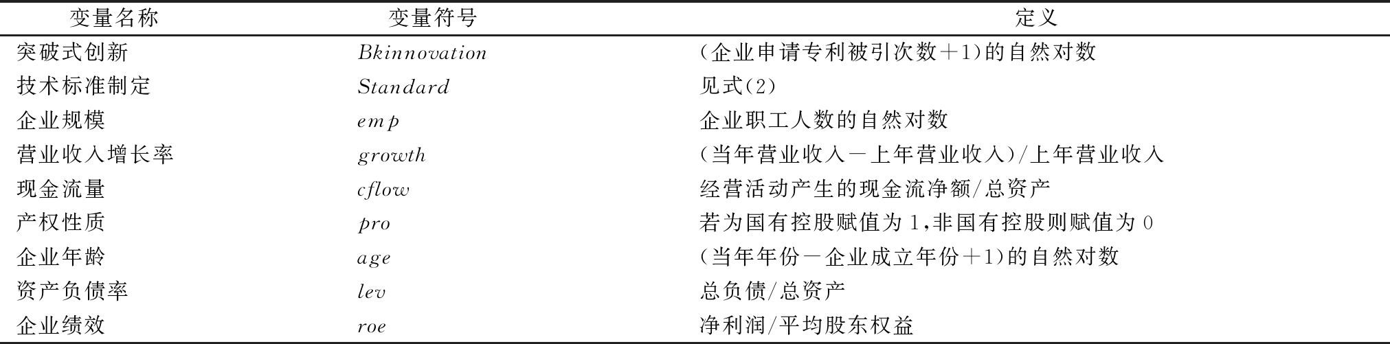 式(1)中,被解释变量Bkinnovationit表示企业i在t年的突破式创新水平;Standardit表示企业技术标准制定程度,其估计系数为β1,为本文核心解释变量,X表示一系列控制变量集合;Provincej表示省份固定效应,Yeart表示年份固定效应;εit为随机干扰项。