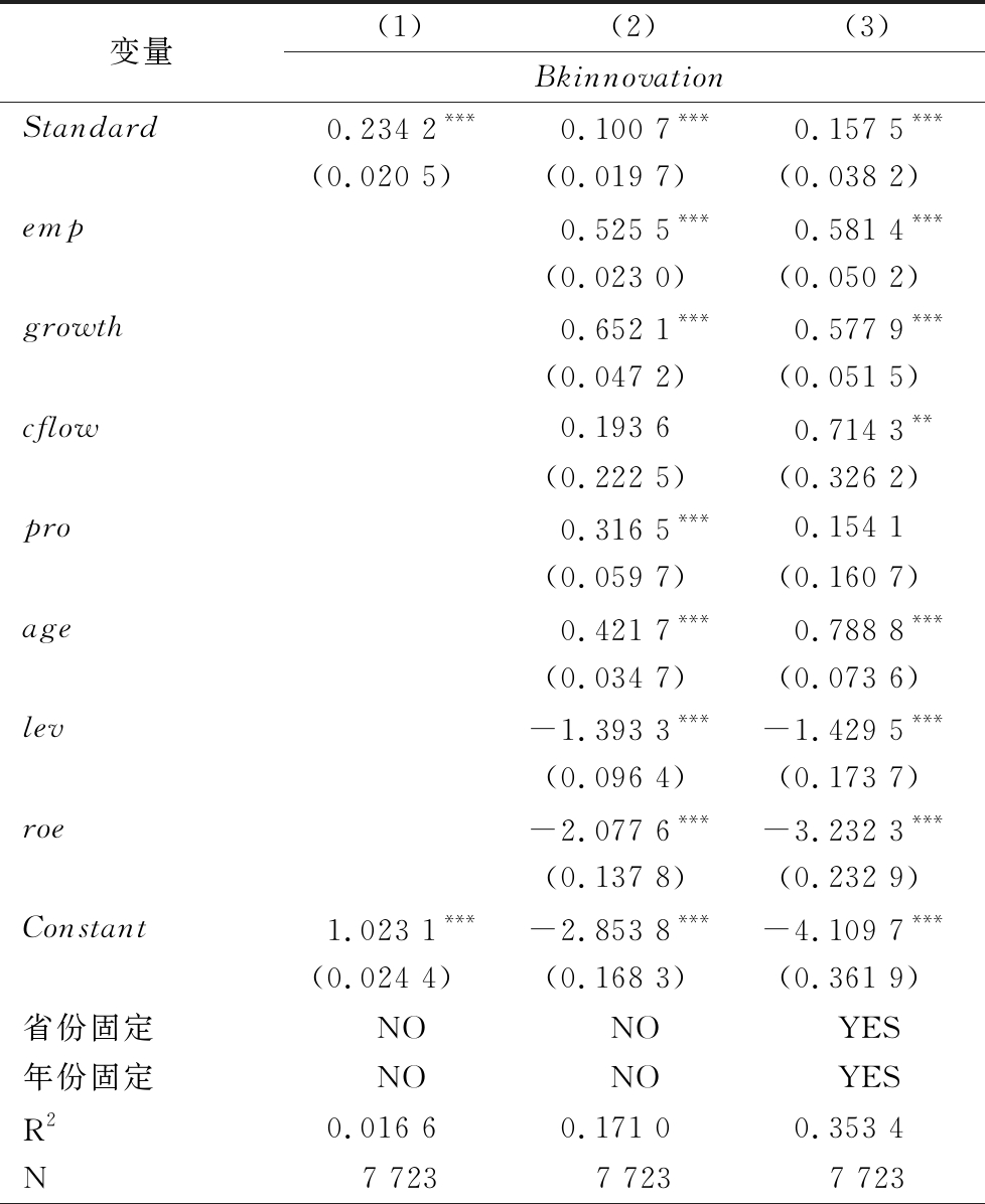 变量(1)(2)(3)BkinnovationStandard0.234 2***0.100 7***0.157 5***(0.020 5)(0.019 7)(0.038 2)emp0.525 5***0.581 4***(0.023 0)(0.050 2)growth0.652 1***0.577 9***(0.047 2)(0.051 5)cflow0.193 60.714 3**(0.222 5)(0.326 2)pro0.316 5***0.154 1(0.059 7)(0.160 7)age0.421 7***0.788 8***(0.034 7)(0.073 6)lev-1.393 3***-1.429 5***(0.096 4)(0.173 7)roe-2.077 6***-3.232 3***(0.137 8)(0.232 9)Constant1.023 1***-2.853 8***-4.109 7***(0.024 4)(0.168 3)(0.361 9)省份固定NONOYES年份固定NONOYESR20.016 60.171 00.353 4N7 7237 7237 723