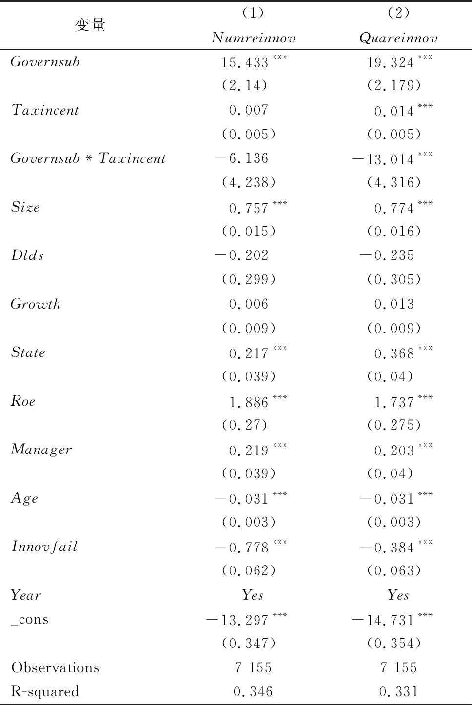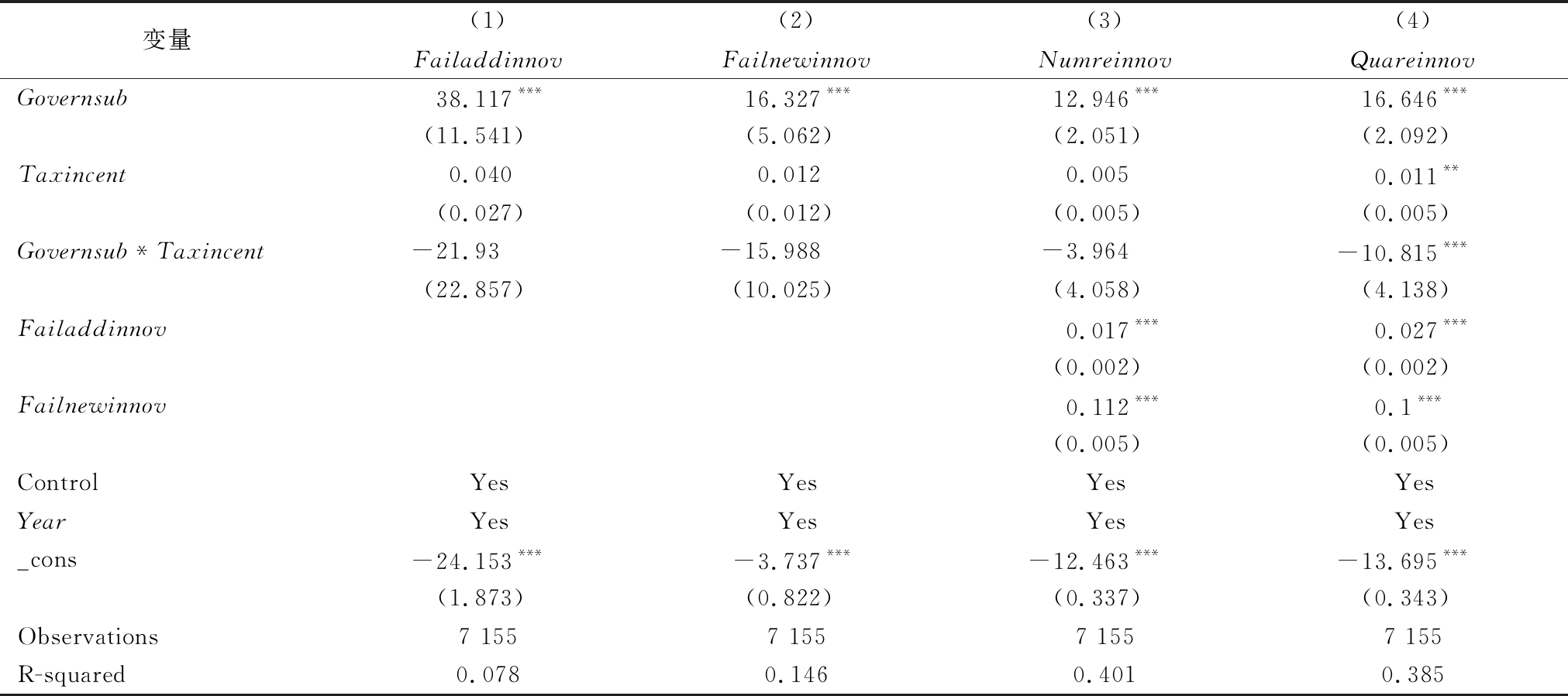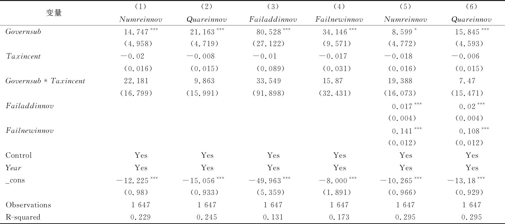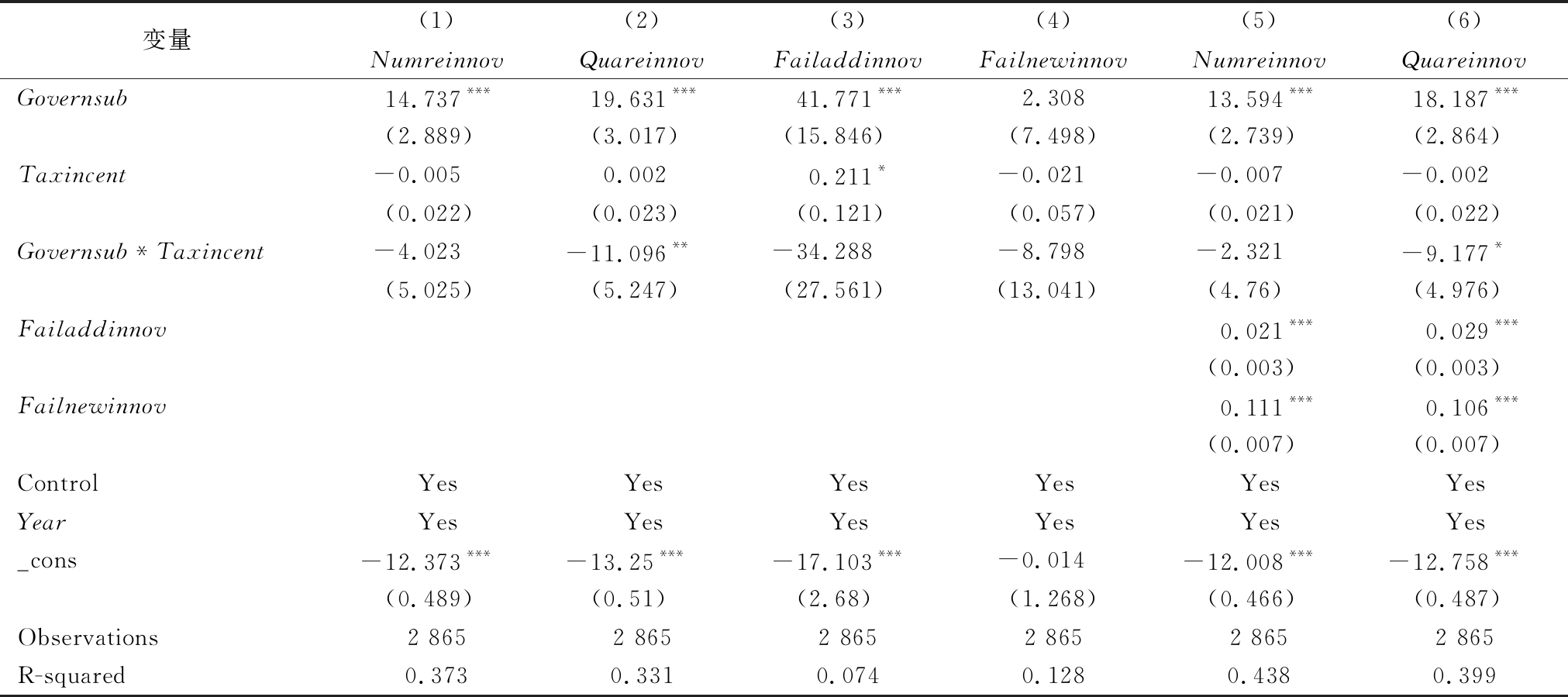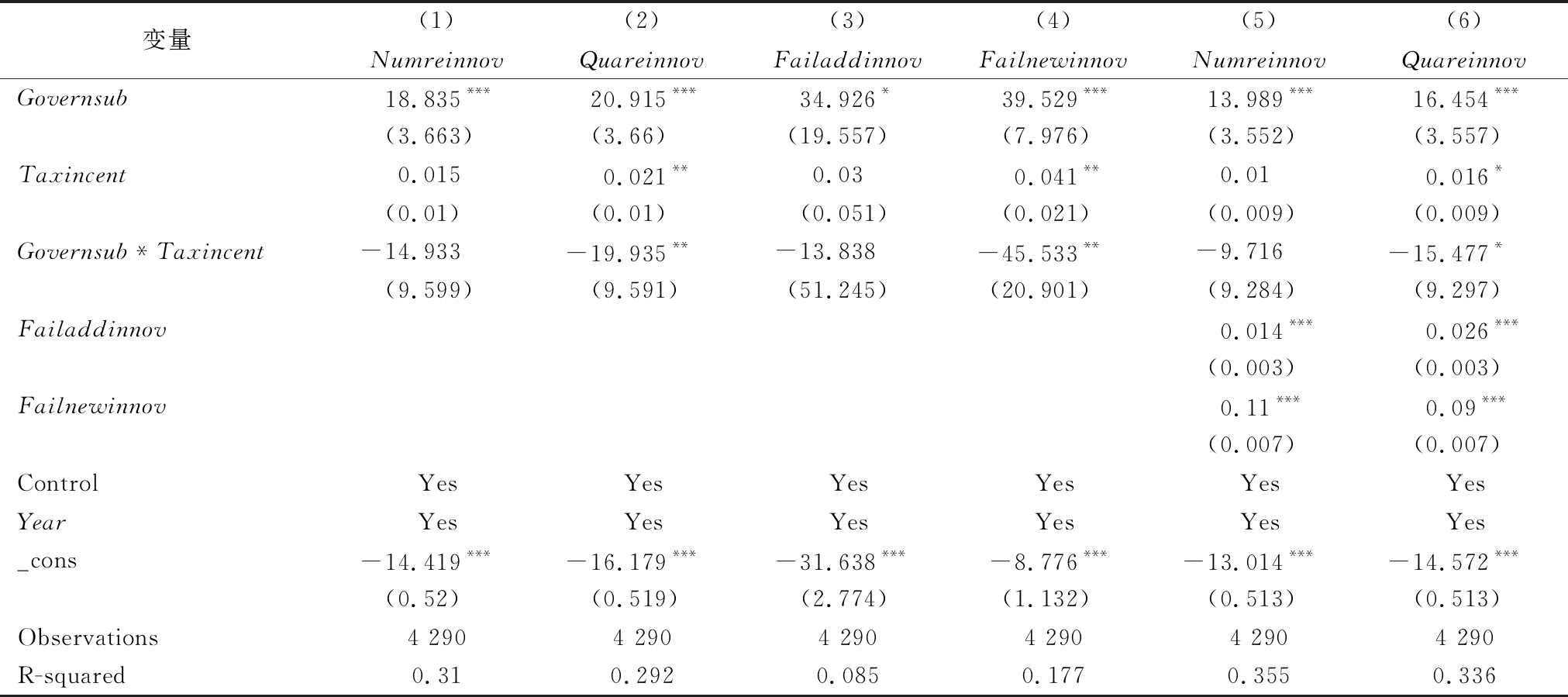 变量 (1)Numreinnov(2)Quareinnov(3)Failaddinnov(4)Failnewinnov(5)Numreinnov(6)QuareinnovGovernsub18.835***20.915***34.926*39.529***13.989***16.454***(3.663)(3.66)(19.557)(7.976)(3.552)(3.557)Taxincent0.0150.021**0.030.041**0.010.016*(0.01)(0.01)(0.051)(0.021)(0.009)(0.009)Governsub*Taxincent-14.933-19.935**-13.838-45.533**-9.716-15.477*(9.599)(9.591)(51.245)(20.901)(9.284)(9.297)Failaddinnov0.014***0.026***(0.003)(0.003)Failnewinnov0.11***0.09***(0.007)(0.007)ControlYesYesYesYesYesYesYearYesYesYesYesYesYes _cons-14.419***-16.179***-31.638***-8.776***-13.014***-14.572***(0.52)(0.519)(2.774)(1.132)(0.513)(0.513) Observations4 2904 2904 2904 2904 2904 290 R-squared0.310.2920.0850.1770.3550.336