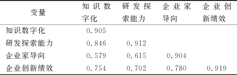 变量知识数字化研发探索能力企业家导向企业创新绩效知识数字化0.905研发探索能力0.8460.912企业家导向0.5790.6150.904企业创新绩效0.7540.7020.7800.919