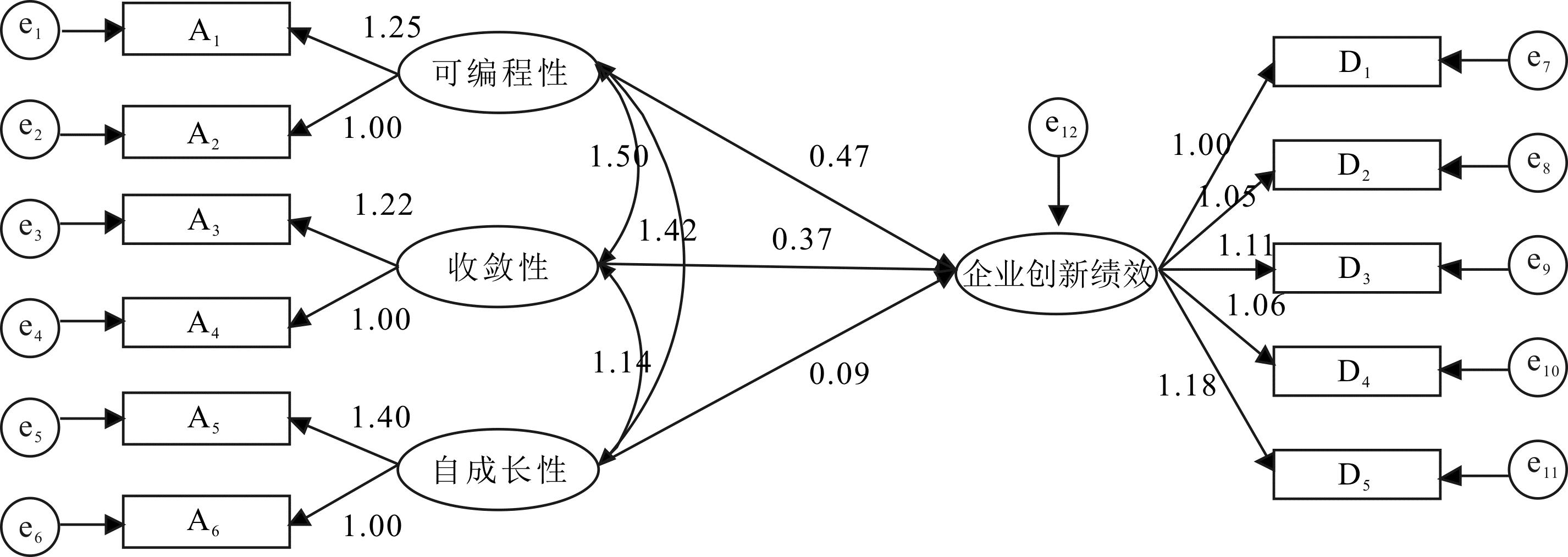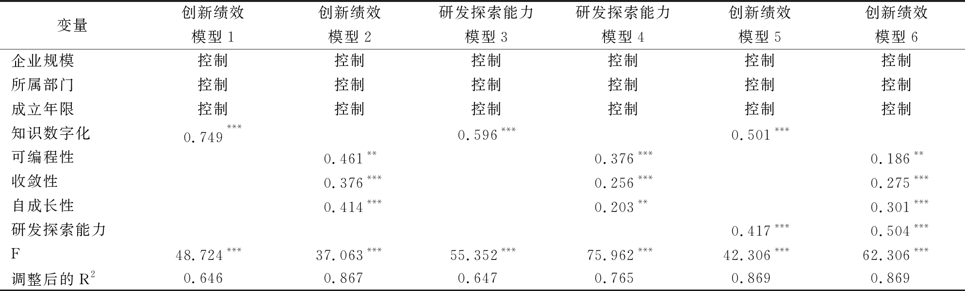变量创新绩效创新绩效研发探索能力研发探索能力创新绩效创新绩效模型1模型2模型3模型4模型5模型6企业规模控制控制控制控制控制控制所属部门控制控制控制控制控制控制成立年限控制控制控制控制控制控制知识数字化0.749***0.596***0.501***可编程性0.461**0.376***0.186**收敛性0.376***0.256***0.275***自成长性0.414***0.203**0.301***研发探索能力0.417***0.504***F48.724***37.063***55.352***75.962***42.306***62.306***调整后的R20.6460.8670.6470.7650.8690.869