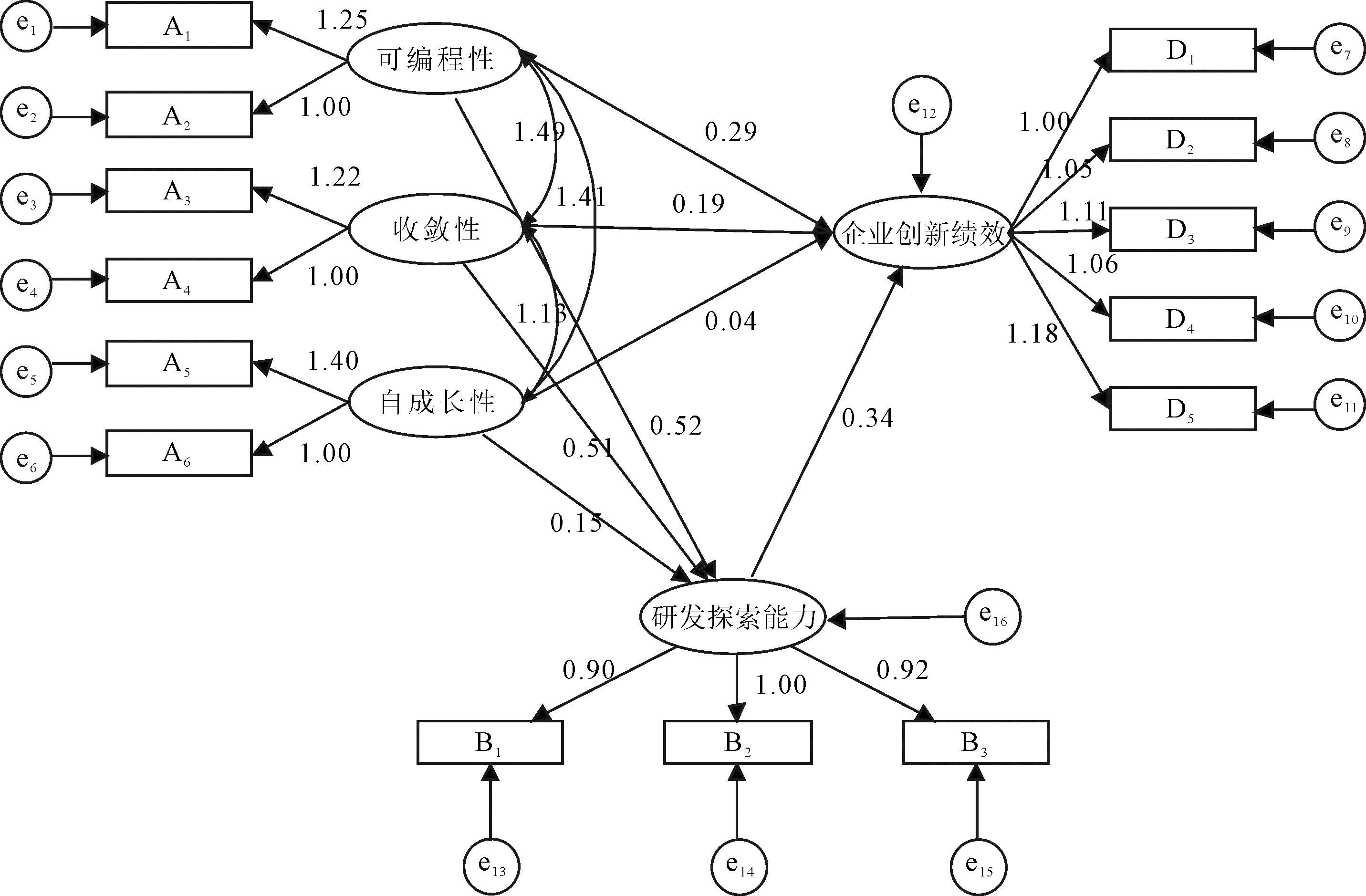 (2)研发探索能力在企业知识数字化与创新绩效之间发挥部分中介作用,且在知识数字化的可编程性、收敛性、自成长性与企业创新绩效之间发挥部分中介作用。研发探索能力决定企业的知识运用程度以及知识重组结果,数字化知识通过研发探索,经历重组和筛选,最终形成有效的创新并提升企业创新绩效。