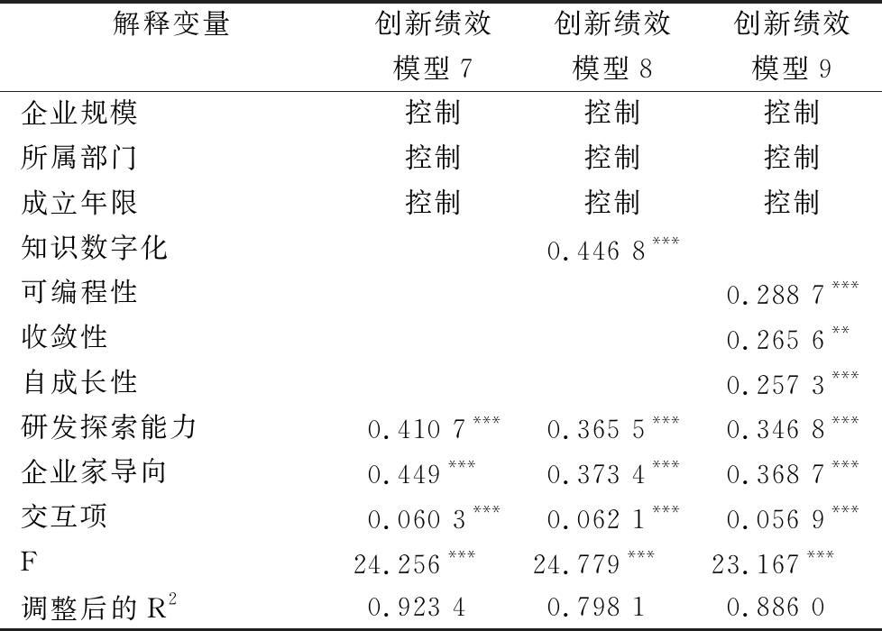本研究通过构建交互项法验证企业家导向对研发探索能力与企业创新绩效关系的调节效应。与分组法相比,其可以避免分组后数据样本不足的问题。因此,构建交互项研发探索能力×企业家导向并进行中心化处理以消除可能存在的共线性问题。具体检验结果如表7所示,其中,模型7是仅包含企业研发探索能力、企业家导向和创新绩效的单一调节模型,模型8是加入企业知识数字化的带有调节的中介模型,模型9是按照可编程性、收敛性和自成长性维度划分后的带有调节的中介模型。结果显示,3种模型下研发探索能力系数分别为0.410 7、0.365 5、0.346 8,且均在Sig<0.001范围内保持显著;交互项系数分别为0.060 3、0.062 1、0.056 9,且均在Sig<0.001范围内保持显著,说明企业家导向在研发探索能力与企业创新绩效之间发挥正向调节作用,假设H5得到支持。