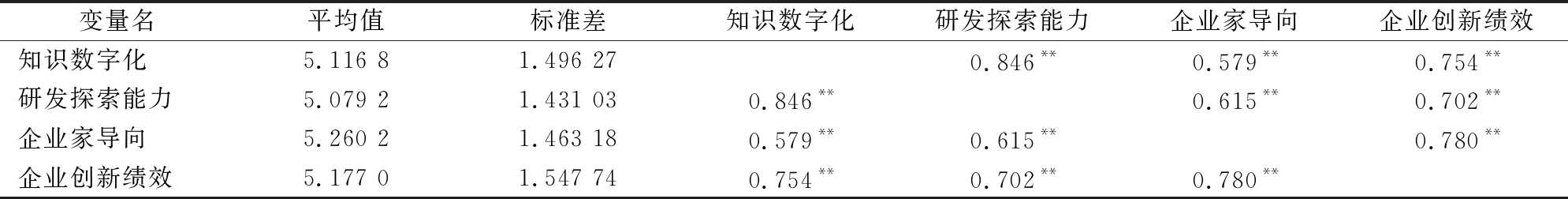 变量名平均值标准差知识数字化研发探索能力企业家导向企业创新绩效知识数字化5.116 81.496 270.846**0.579**0.754**研发探索能力5.079 21.431 030.846**0.615**0.702**企业家导向5.260 21.463 180.579**0.615**0.780**企业创新绩效5.177 01.547 740.754**0.702**0.780**