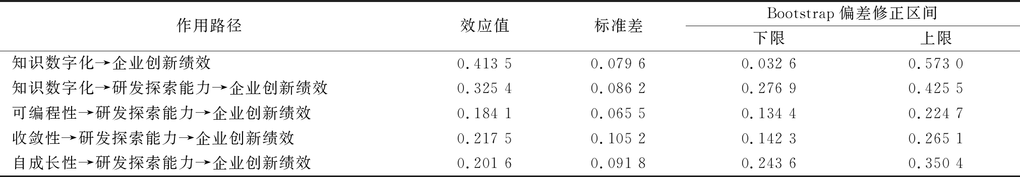 作用路径效应值标准差Bootstrap偏差修正区间下限上限知识数字化→企业创新绩效0.413 50.079 60.032 60.573 0知识数字化→研发探索能力→企业创新绩效0.325 40.086 20.276 90.425 5可编程性→研发探索能力→企业创新绩效0.184 10.065 50.134 40.224 7收敛性→研发探索能力→企业创新绩效0.217 50.105 20.142 30.265 1自成长性→研发探索能力→企业创新绩效0.201 60.091 80.243 60.350 4