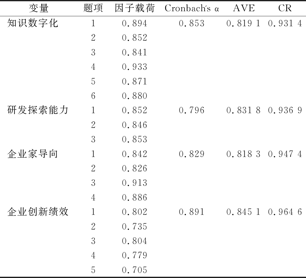 变量题项因子载荷Cronbach's αAVECR知识数字化10.8940.8530.819 10.931 420.85230.84140.93350.87160.880研发探索能力10.8520.7960.831 80.936 920.84630.853企业家导向10.8420.8290.818 30.947 420.82630.91340.886企业创新绩效10.8020.8910.845 10.964 620.73530.80440.77950.705