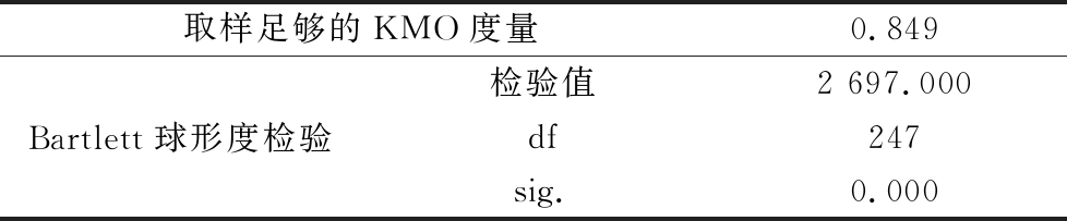 取样足够的KMO度量0.849Bartlett球形度检验检验值2 697.000 df247 sig.0.000