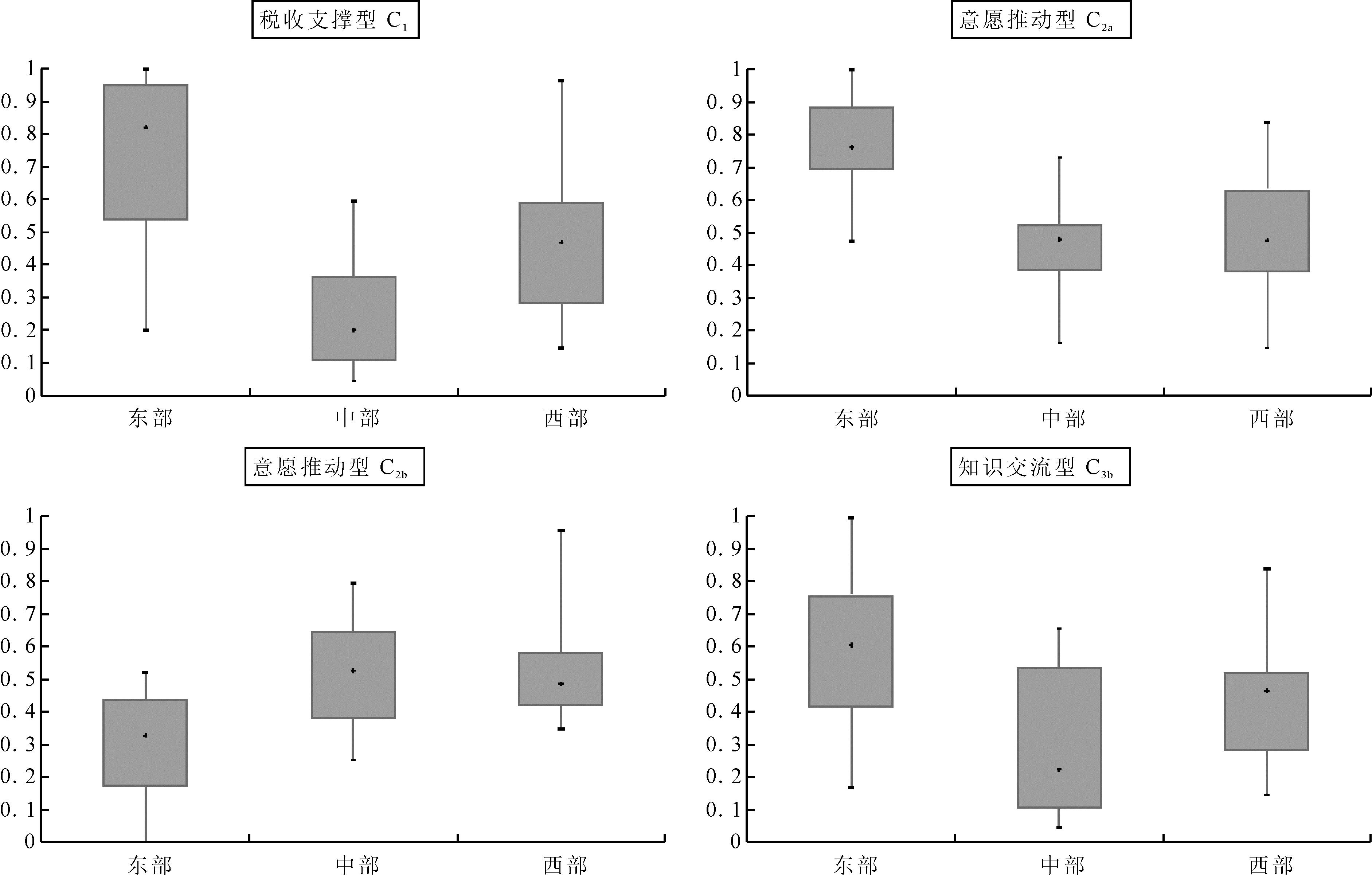 由表5可知,各组态的组内一致性调整距离均小于判定标准0.2,说明5个组态对各省份的解释力无明显差异。参考已有研究[26],通过区域划分探究各组态覆盖力度在东部、中部和西部是否存在明显的地域偏好。动态fsQCA方法未直接对案例进行分组,而单因素方差分析法则能够对比多组数据的均值。鉴于各组态在各案例上的覆盖度水平均服从正态分布且方差齐性,符合该方法的应用条件,因此本文对案例进行区域划分,利用单因素方差分析法研究各组态在不同区域的覆盖度均值是否存在显著差异[26],结果如表6所示。其中,组态C3a能解释的案例分布未呈现明显的地域差异,说明该组态不受地理位置的影响,空间分布较广,以科技基础设施为平台增进知识交流的发展路径具有普适性。组态C1、组态C2a、组态C2b、组态C3b能解释的案例分布呈现明显的地域差异,分别绘制区域分布箱线图,如图3所示。