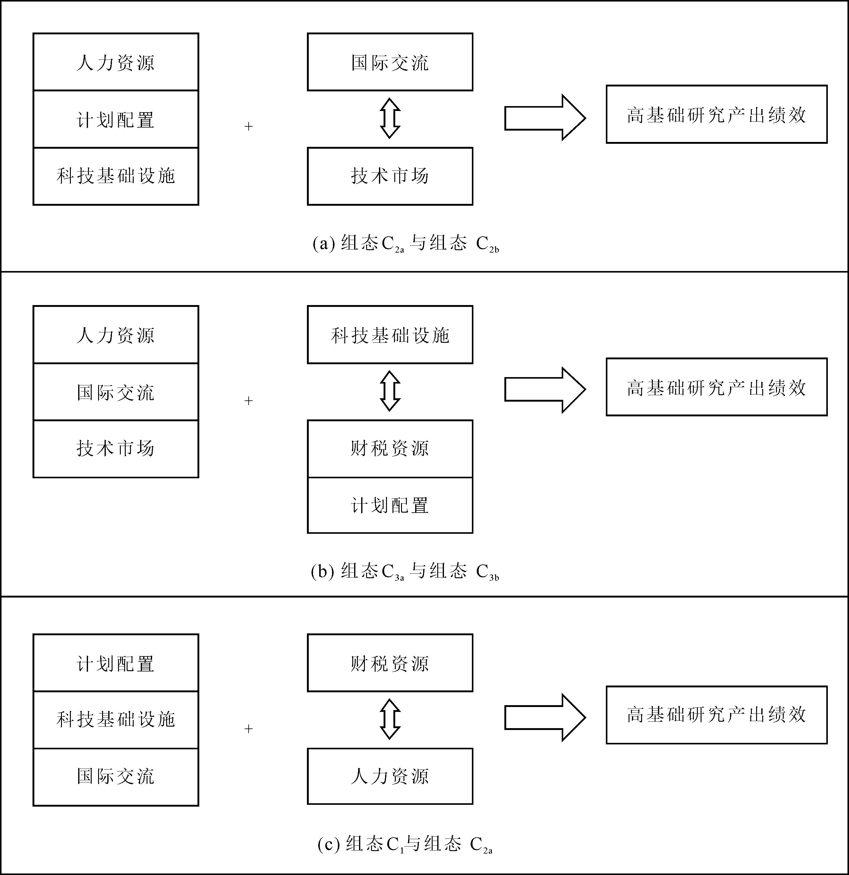 (2)意愿推动型(组态C2a、C2b)。在该构型下,人力资源、计划配置和科技基础设施发挥主导作用。在缺少强大财税支撑的前提下,以政府对基础研究的推动意愿为基础,在科技资源计划配置能力的加持下,通过兴建科技基础设施、鼓励科研人员开展基础研究等方式,为基础研究活动注入发展动能。该构型内两种组态路径的区别在于:组态C2a侧重于国际交流,即政府在调控人力、物力、财力等科研资源的同时,鼓励与国际接轨以获取基础研究前沿知识、发展方向和国际合作力量;组态C2b侧重于在宏观税负不足的情形下,辅以技术市场的牵引作用,带动更多应用型基础研究成果产出。该构型验证了李正风强调“基础研究发展需要‘有为政府’开展规划、组织和凝聚”的理论观点[25],进一步指出“有为政府”的着力点。