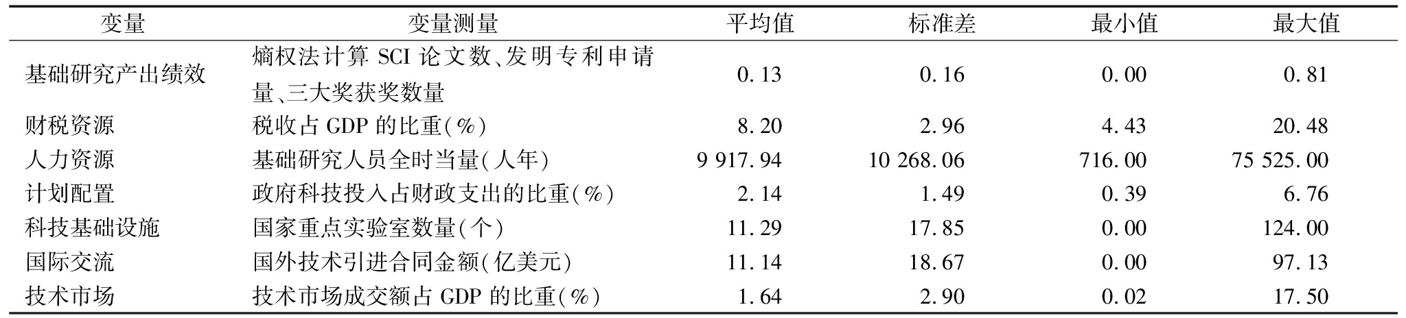 本文以中国内地30个省份为研究样本,主要基于以下考虑:①从研究对象看,推动基础研究发展需要整合多方力量、多种资源,省级政府相比于地级市政府,政策影响力更广、资源整合能力更具优势;②从数据可获得性看,基础研究相关数据往往从省级层面统计,省级数据视角更加丰富。本文数据主要来源于中国研究数据服务平台(CNRDS)、《中国基础研究竞争力报告》、《中国统计年鉴》和《国家重点实验室年度报告》。鉴于数据来源较为广泛、部分指标统计起始年份较晚,结合数据统计口径一致性,最终以2011—2021年为时间跨度进行数据汇总,部分缺失值采用线性插值法进行补齐。