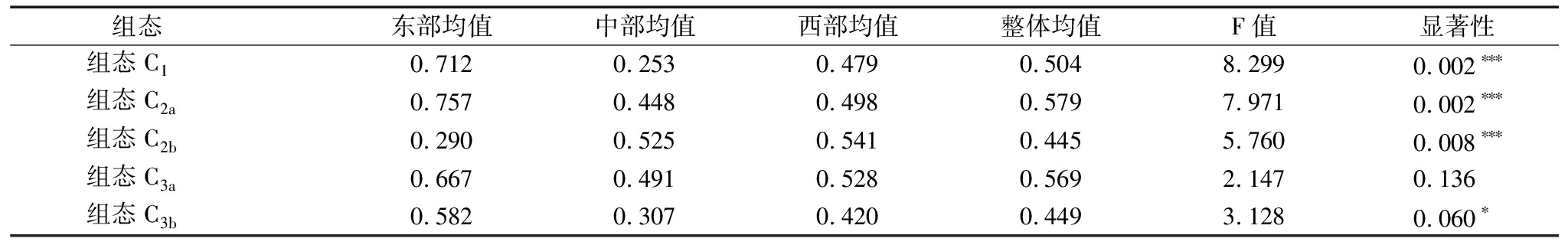 组态 东部均值中部均值西部均值整体均值F值显著性组态C10.712 0.253 0.479 0.504 8.299 0.002∗∗∗组态C2a0.757 0.448 0.498 0.579 7.971 0.002∗∗∗组态C2b0.290 0.525 0.541 0.445 5.760 0.008∗∗∗组态C3a0.667 0.491 0.528 0.569 2.147 0.136 组态C3b0.582 0.307 0.420 0.449 3.128 0.060∗