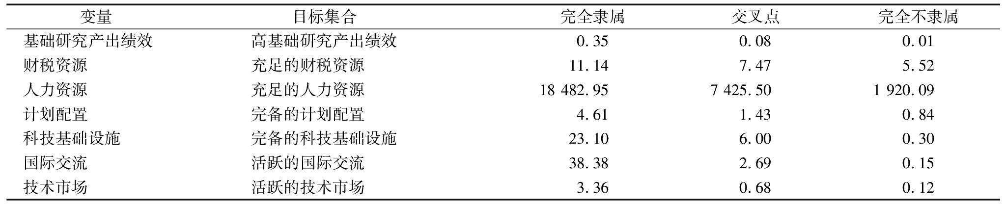 变量 目标集合 完全隶属交叉点完全不隶属基础研究产出绩效高基础研究产出绩效0.35 0.08 0.01 财税资源充足的财税资源11.14 7.47 5.52 人力资源充足的人力资源18 482.95 7 425.50 1 920.09 计划配置完备的计划配置4.61 1.43 0.84 科技基础设施完备的科技基础设施23.10 6.00 0.30 国际交流活跃的国际交流38.38 2.69 0.15 技术市场活跃的技术市场3.36 0.68 0.12