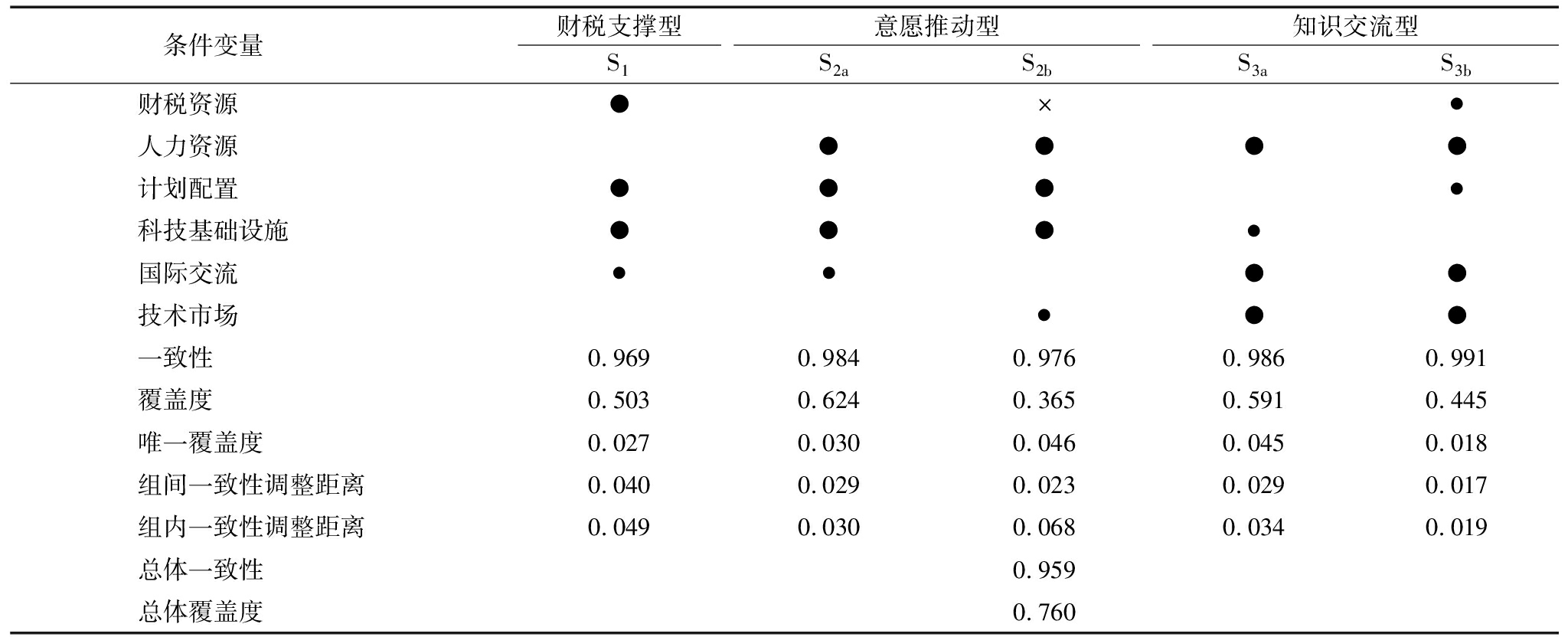 条件变量 财税支撑型S1意愿推动型S2aS2b知识交流型S3aS3b财税资源●×●人力资源●●●●计划配置●●●●科技基础设施●●●●国际交流●●●●技术市场●●●一致性0.969 0.984 0.976 0.986 0.991 覆盖度0.503 0.624 0.365 0.591 0.445 唯一覆盖度0.027 0.030 0.046 0.045 0.018 组间一致性调整距离0.040 0.029 0.023 0.029 0.017 组内一致性调整距离0.049 0.030 0.068 0.034 0.019 总体一致性0.959总体覆盖度0.760