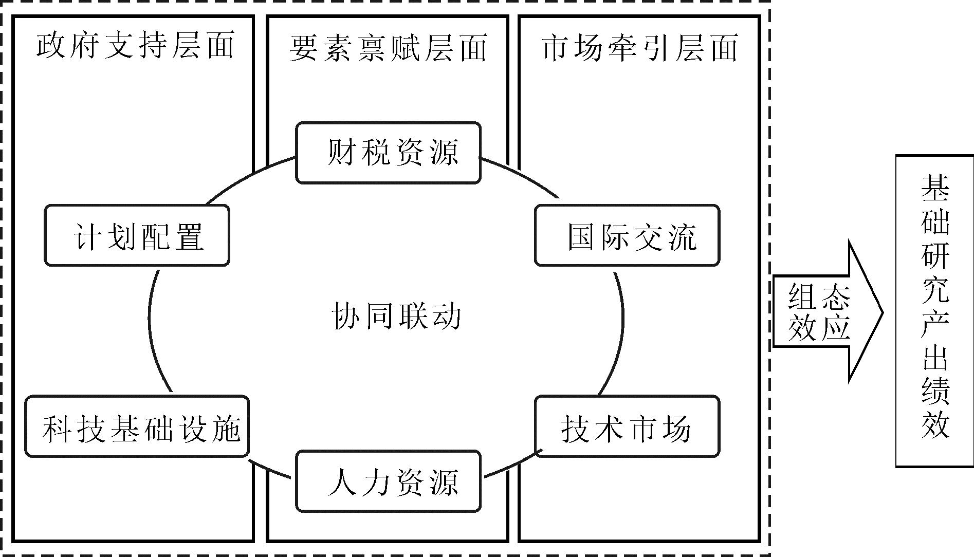 综上所述,现有文献通过分析单个要素的作用机制,探究不同因素对基础研究的影响机理,为本文从要素禀赋、政府支持、市场牵引层面开展驱动因素研究提供了理论基础。然而,现有研究未揭示基础研究驱动因素间的复杂互动关系,对驱动因素间的协同作用机制探讨较少。组态视角侧重于分析因素联动对结果的影响,以明确某一结果产生的内在机理,能够帮助学者了解现象背后的深层次、多组合原因(杜运周等,2017),适用于探究基础研究驱动因素的组合作用。因此,本文在“要素—政府—市场”分析框架的基础上,结合组态视角,探究推动基础研究发展的组态路径,即财税资源、人力资源、计划配置、科技基础设施、国际交流、技术市场6个驱动因素如何通过协同联动和组态匹配影响基础研究产出绩效。